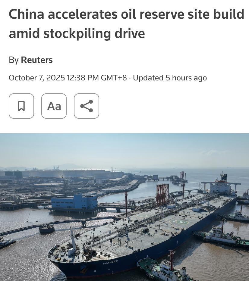 11个地区白色储油罐耸立!五角大楼如坐针毡,中方准备动真格的了? 刚刷到一篇路透社的文章,据其去年10月份的披露,中方正在2025年和2026年新增11个石油储备基地,总容量高达2680万立方米(约合1.69亿桶)。对于一个原油对外依存度逼近60%的世界最大原油进口国而言,这无疑是其能源安全战略的关键一步。 要知道现在中国手里的石油储备,已经能撑110天的消费量,等这些新基地建好,到2026年就能撑140到180天,快小半年了。 这可不是囤着玩的,中国现在原油对外依存度快60%,一半多的油得从国外买,中东的沙特、伊拉克,中亚的哈萨克斯坦,还有俄罗斯,油要运过来,得经过马六甲海峡、霍尔木兹海峡这些地方,万一哪天地缘政治出点事儿——比如海峡堵了、油价突然飙了,没储备的话,国内的加油站、化工厂就得慌。 以前遇到这种情况,可能得急急忙忙找美国或者其他国家协调,现在储备多了,就算短期断供,也能先靠储备顶着,慢慢找解决方案,不用再被人牵着鼻子走。 五角大楼那边立马就坐不住了 —— 倒不是怕这些罐子出啥安全问题,是怕中国把能源安全的 “底” 给兜牢了,美国以前靠石油拿捏人的老招,以后越来越不好使了。 早年间美国想拿捏谁,经常从石油下手,比如制裁伊朗,不让其他国家买伊朗的油,硬生生把油价推高;或者跟沙特商量减产,让依赖进口的国家难受。 中国以前储备少,遇到这种情况只能捏着鼻子妥协,现在储备够多了,就算美国搞点动作,中国也能扛住——油价涨了,咱先从储备里调油,不用急着高价买;某条运输线堵了,咱还有其他路线的油能补,美国这招的威力直接减了大半。 更让美国不安的是,中国的储备基地布局还藏着“后手”。这11个基地不是堆在一个地方,有的靠近沿海港口,方便从中东、非洲运过来的油直接卸罐;有的靠近陆路管道,比如从俄罗斯、中亚通过油气管道运过来的油,能直接存进去。 这样不管哪条路出问题,都有备份,美国想掐断某一条路线卡中国脖子,根本没用。比如以前美国总想着控制马六甲海峡,觉得掐住这儿就能断中国一半的油路,现在中国既有储备,又有中巴经济走廊、中哈管道这些备用路线,马六甲的“命门”效应早没那么强了。 还有个关键点,中国能源安全稳了,在国际上的话语权也跟着硬了。以前跟东南亚国家合作,可能还得因为“怕油不够”而看美国脸色,现在不用了——咱自己有储备,跟东盟做能源合作时,能更从容地谈条件,甚至帮他们一起搞能源安全,美国在亚太想靠能源牵制中国的算盘,自然就落空了。 五角大楼那边算得门儿清:中国这不是在跟美国对着干,是在给自己的发展上保险,可这保险一上,美国想靠能源拿捏中国的筹码,就越来越少了。 其实说到底,中国搞这些石油储备,根本不是要跟谁较劲,就是想把自己的日子过稳。以前国际上谁都知道中国“油袋子”软,美国能靠着这个牵制中国,现在中国把“油袋子”撑硬了,五角大楼自然坐不住。 这事儿也说明,中国现在做的每一步,都是在补自己的短板,让自己在复杂的国际环境里更有底气——毕竟手里有粮、罐里有油,心里才能不慌,美国那些想拿捏人的手段,也就慢慢失去用武之地了。