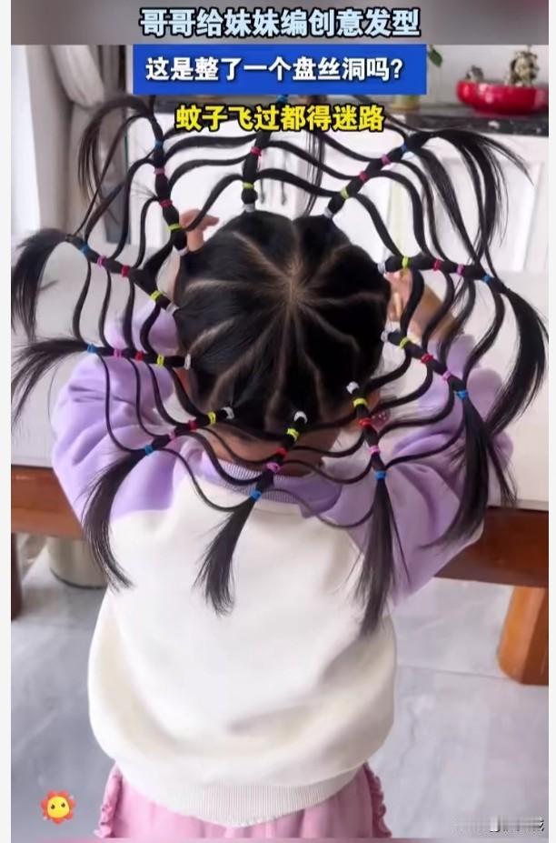 看到女孩子的这种盘丝洞发型是不是后悔没生个女儿? 这发型是不是比天线宝宝发型更胜一筹,这没有一点技术含量还真不会编这种辫子,看到这种发型瞬间是不是觉得有个女孩子真好,可以给她随便编她喜欢的发型,不仅自己喜欢,就连孩子出门那回头率也是瞬间爆棚,盘丝洞般的发型蚊子是不是飞过去都得迷路?