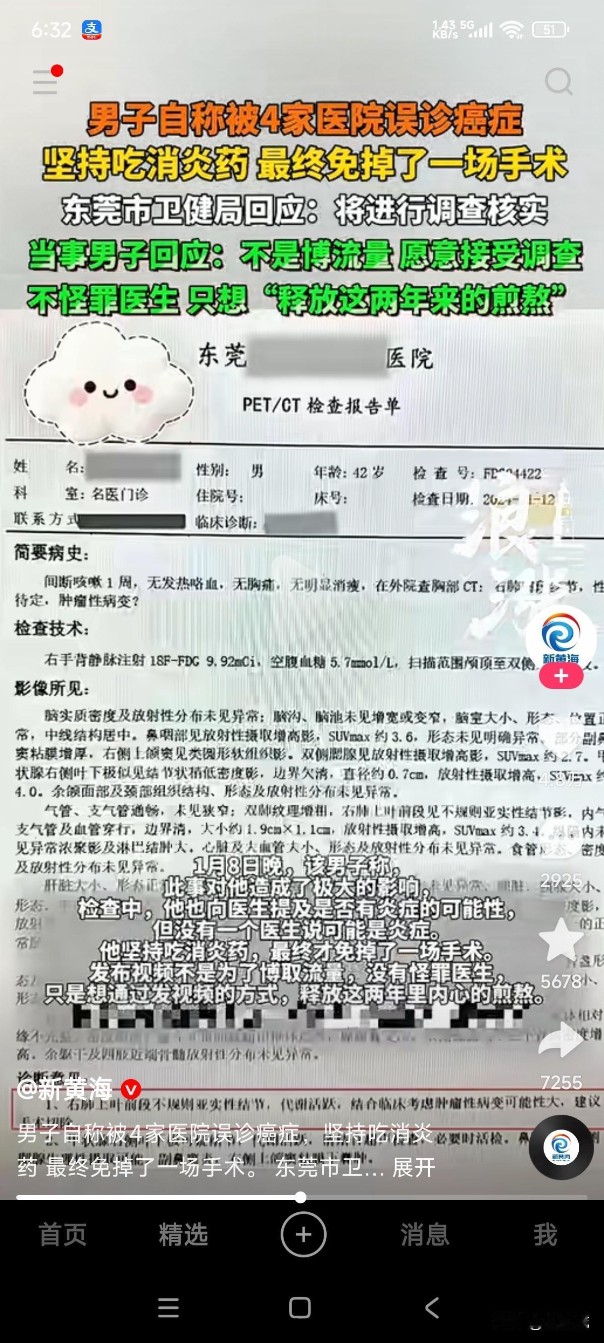 广东42岁男子自称被4家医院误诊癌症,坚持两年吃消炎药,最终免掉了一场手术,四家医院居然没有一个医生说可能是炎症。 他声称发布视频不是为了博取流量,也并没有怪罪医生的意思,只是想通过发视频的方式,释放一下这两年来内心里的煎熬和对他生活造成极大的影响,这究竟是男子的抵抗力强把癌症的病毒给消灭了,还是说这四家医院都同时给误诊了,误诊的情况也很常见,但不至于四家医院全部都误诊的吧,难道这四家医院都是同一个医生给他看的吗? 误诊确实对患者造成的心里影响和生活影响很大,但四家医院同时都是误诊的操作着实让人看不懂,这究竟是医生的问题还是医术的问题?