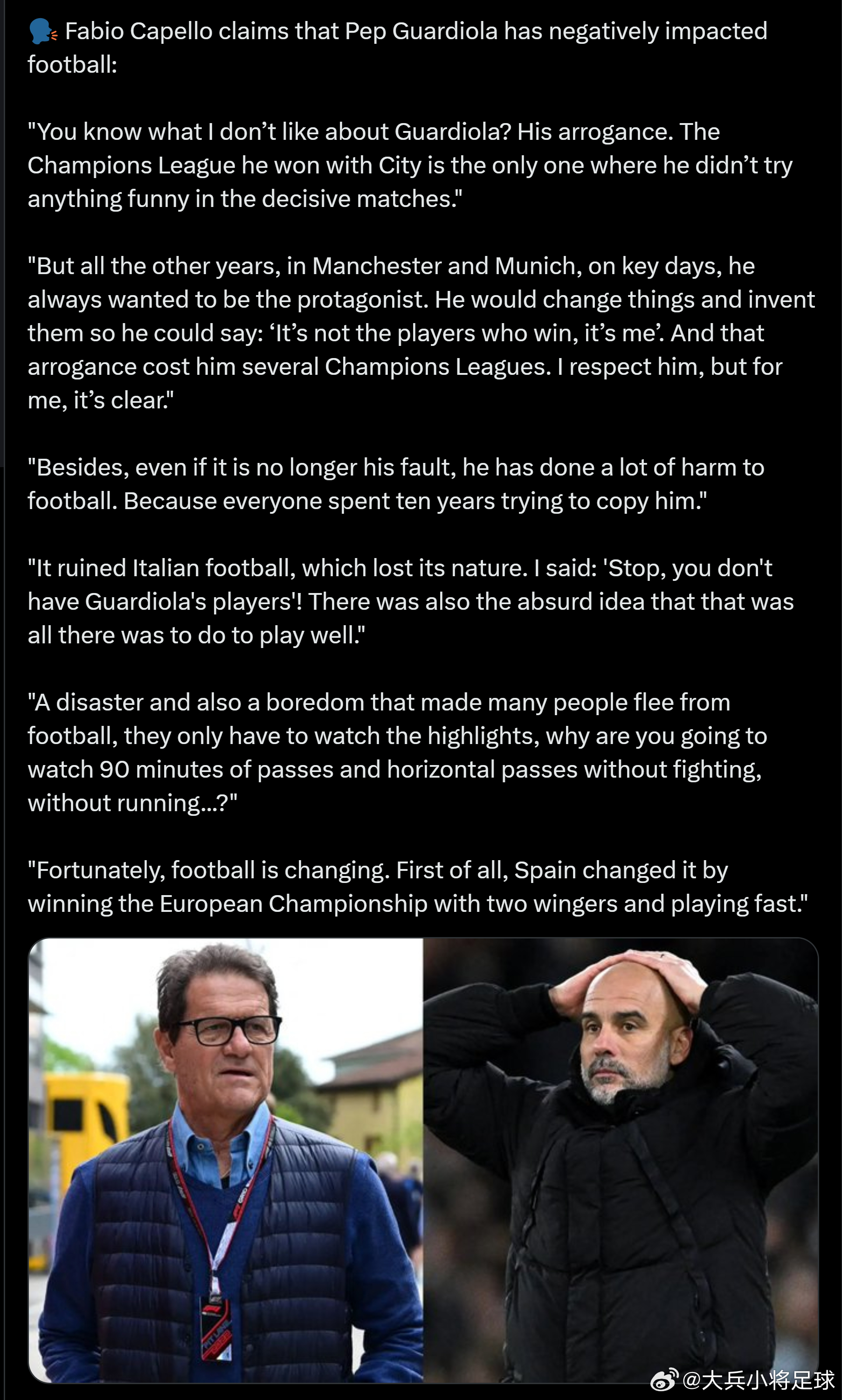 欧洲足球(152):卡佩罗称瓜迪奥拉对足球产生了负面影响:“你知道我最不喜欢瓜迪奥拉什么吗?就是他的傲慢。他率曼城夺得的那座欧冠,是唯一一次他在关键比赛中没有搞什么花样。”“但在其他年份,无论是在曼城还是拜仁慕尼黑,在决定性比赛日,他总是想成为主角。他会频繁变阵、发明新招,就为了能说:‘赢得比赛的不是球员,是我’。这种傲慢让他错失了几座欧冠。我尊重他,但在我看来,这一点很清楚。”“此外,即便现在已不再是他的责任,他也给足球带来了很大危害。因为过去十年,所有人都试图模仿他。”“这毁掉了意大利足球,让它失去了原本的特性。我曾说过:‘停下来吧,你们没有瓜迪奥拉那样的球员!’还出现了那种荒谬的想法,认为踢得好就只有这一种方式。”“这是一场灾难,也带来了极度的乏味,导致许多人远离足球。他们只需看集锦就够了,为什么要花90分钟去看毫无对抗、毫无跑动、只有传球和横传的比赛……?”“幸好,足球正在发生变化。首先,西班牙队通过使用两名边锋、快速进攻的方式赢得了欧洲杯,改变了这一切。”