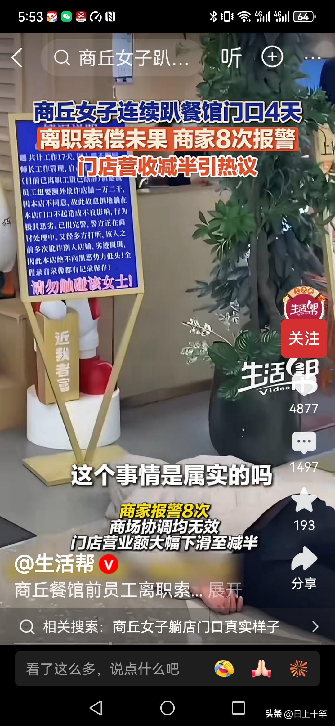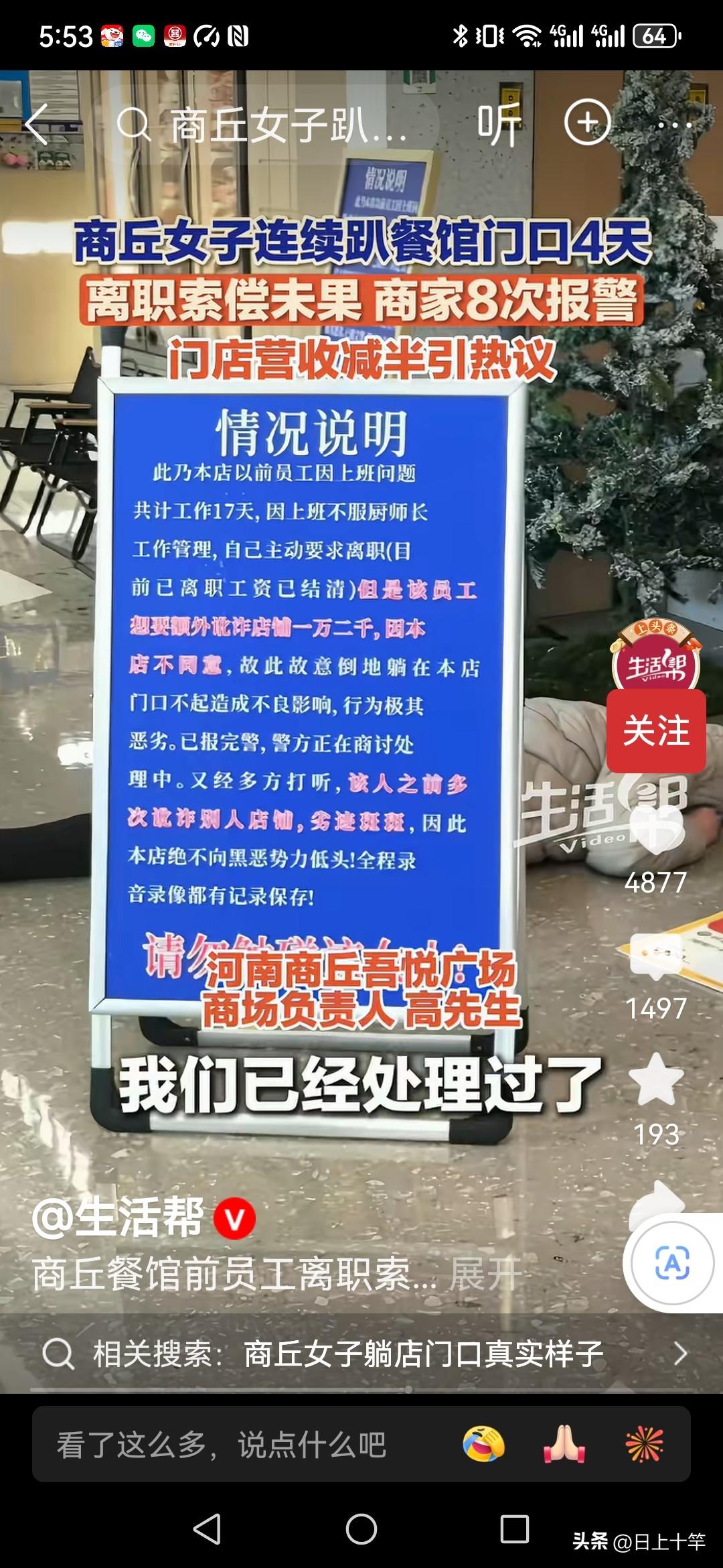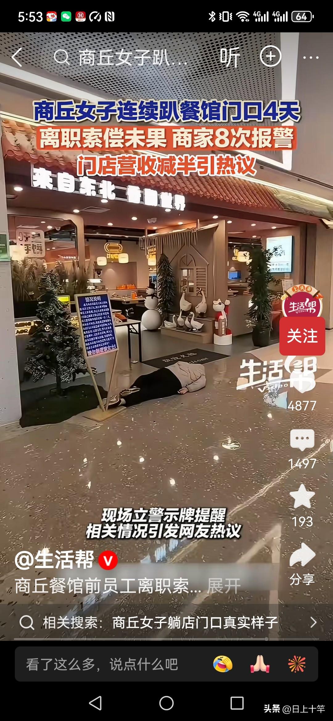 河南商丘一位餐厅员工,因为离职的时候和老板没谈拢,感觉该给的钱没给,心里憋得慌! 他也没吵没闹,就这么躺着,就躺在饭店门口整整四天! 大家看看,逼得餐馆报警八次。结果警方来了之后,发现也很无奈,他也没吵没闹,也不要死要活,更没有和餐馆直接起冲突, 按理说餐馆门口也是公共空间,他就躺在那里没毛病! 所以警察也只能劝导为主,关键是餐馆老板也硬顶着不赔偿,就看小伙能够躺几天, 而且还在门口立了个告示,请大家注意脚下, 结果现在是两败俱伤,餐馆营业额下降一半,小伙躺了四天也是头昏脑胀, 不过目前还没有解决,就看谁能熬过谁!