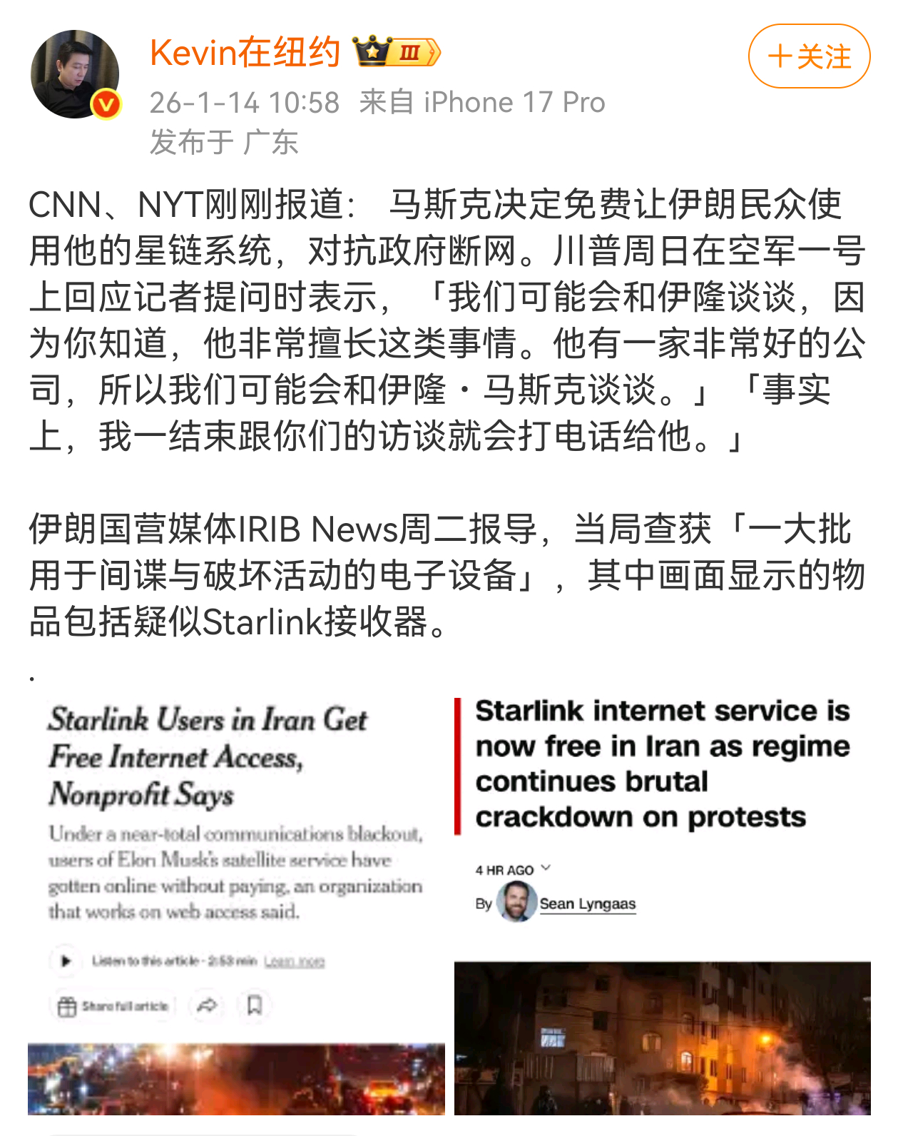 很多网友请我点评这个消息。1.“每逢大事就扯星链”已经成为了固定宣传套路,每次都是全球热点,这次也不例外,宣传很成功。2.走私星链设备必须经过官方授权才能工作,特朗普刚准备让马斯克这样做,跟之前已经大量使用的说法有矛盾。3.伊朗能力孱弱,没有本国境内的无线电主权。4.伊方报道有几百部且被干扰八成,反对派报道有几万部,数量应该在二者之间,具体靠近哪一方?取决于哪个对方更不要脸。5.从技术角度而言,干扰星链信号很容易。6.走私星链设备具体能起多大作用?我觉得主要是颜革的象征作用。