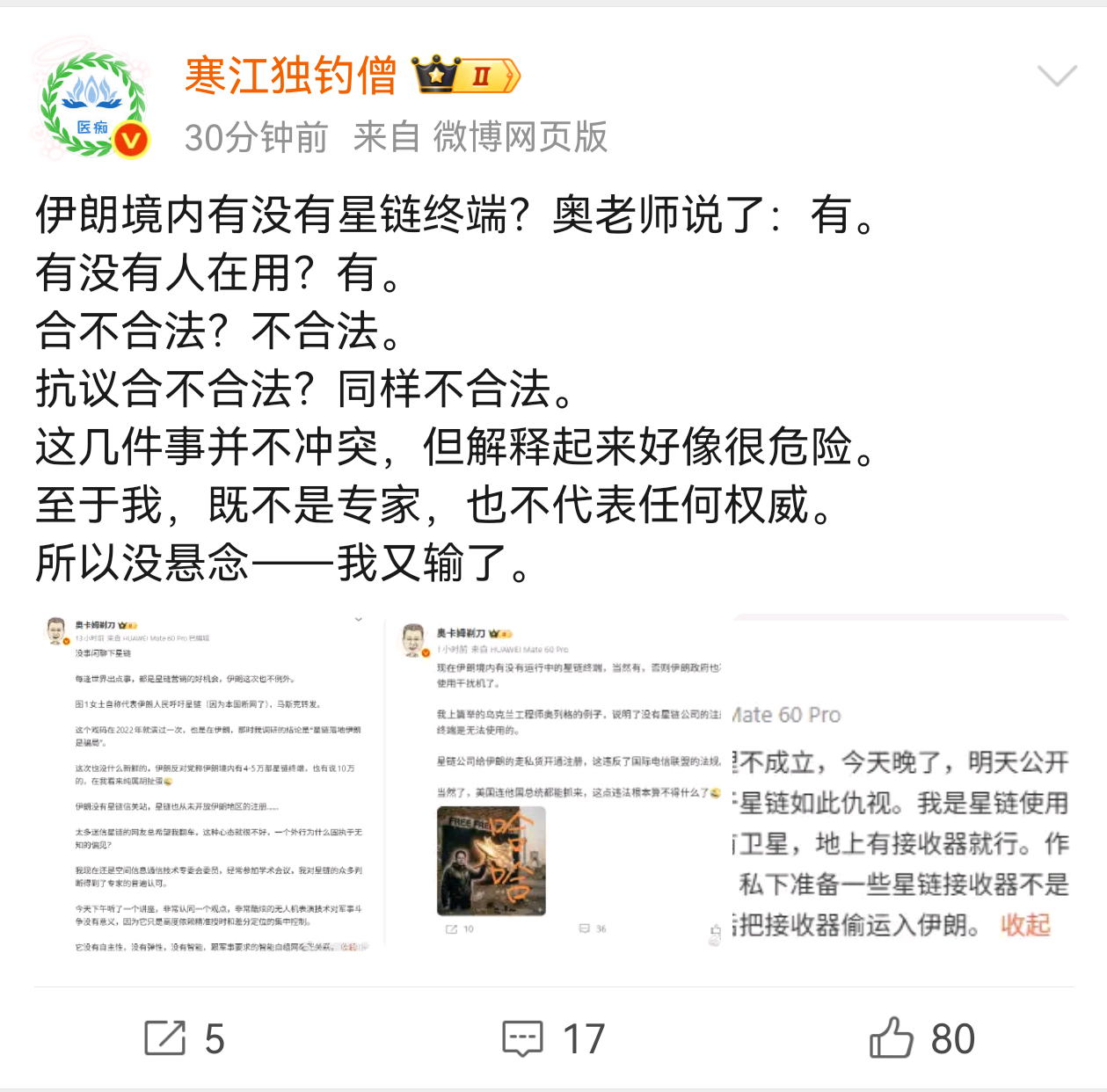 有人问我“星链在乌克兰战场上有作用吗?”我只能老老实实地回答“有”,因为一把铁锹都有作用。但是,有多大作用才是关键。聊胜于无、有点小用、作用显著、作用关键,这区别大了。所以我称之为虚假宣传。伊朗有多少部星链终端?几百部且八成被干扰,几万部都在活跃工作,这也区别大了。只问“有没有”,只要伊朗有一部,那你就赢了,这就是话术