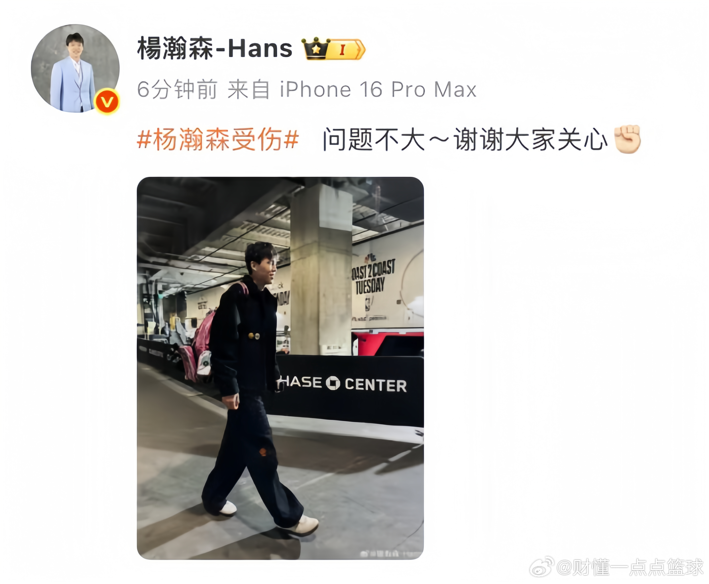杨瀚森社媒更新动态报平安!杨瀚森今天在开拓者对阵勇士的比赛中,拼抢球时被对方球员的膝盖撞到后脑勺,后进入了更衣室进行检查。目前,他表示自己没有多大问题。没事就好,今天他获得了12分钟33秒的出场时间,3投1中贡献3分2篮板。