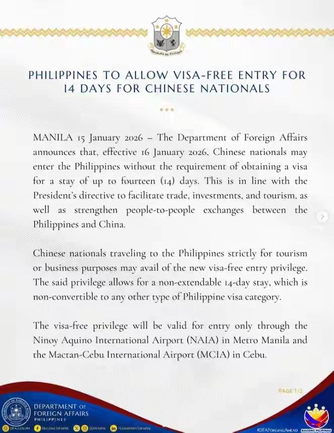 1月15日,菲律宾外交部官宣,自1月16日起对中国公民实施免签政策。中国游客经马尼拉、宿务机场入境可停留最长14天,且期限不可延长。此举旨在促进两国贸易、投资与旅游,深化人文交流。 网友评论: 祖国如此多娇,地大物博,人之阳气发于东方,960万平方公里的神州大地已足够你用余生丈量,何故舍近求远,平平安安比什么都好,我情愿做个井底之蛙,有空多去看看祖国的大好河山就心满意足了 别说免签了,免机票也不去 08年的时候、一个上海女大学生自己去菲律宾旅游、在宾馆被劫持、刚洗完澡后就被绑架了、最后拿了几十万人民币才救回来。 马科斯执政,别去菲律宾旅游,等杜特尔特女儿做总统,执政了,我才去菲律宾旅游。 菲律宾