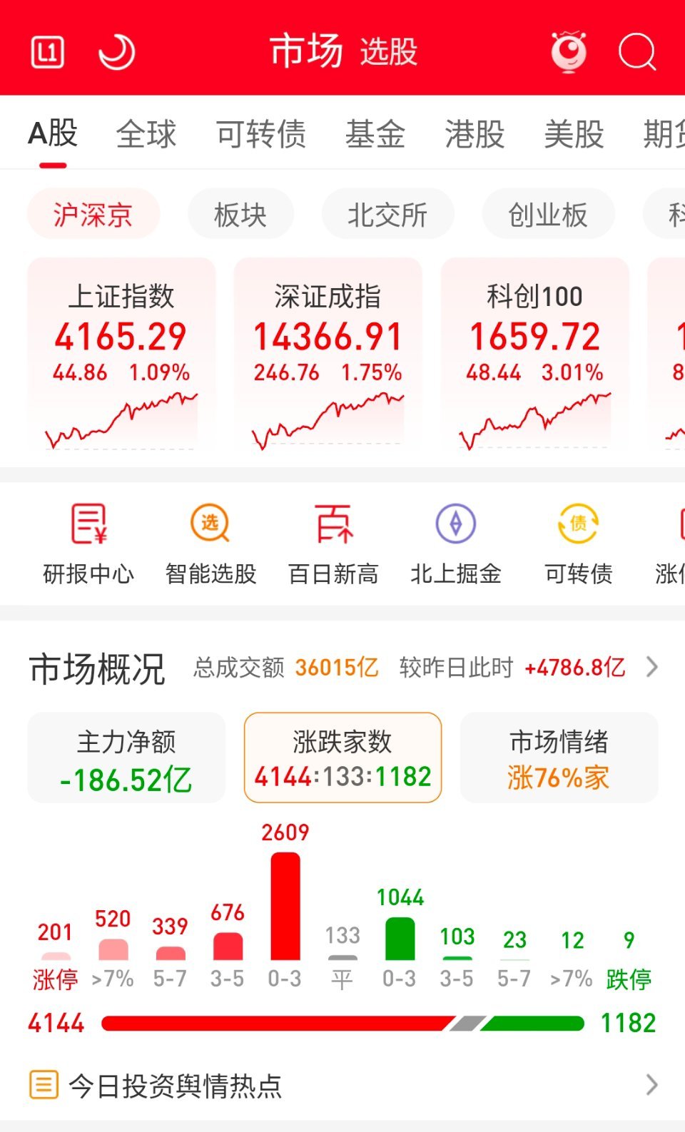 昨天勉强跑赢大盘,但1月份目前远远跑输行情。让人有点焦虑。依然没机会满仓,继续等待。“春季躁动”和新一波科技股大涨行情如期来临,比想象中还猛。不过个人账户依然坚守阵地,不盲目操作。4100点以上的市场,大家都没有经验,但还是苟一点好,别冲太猛。考虑到1月份特殊节点,还是要小心业绩雷。a股涨疯了一天创2项纪录今日看盘