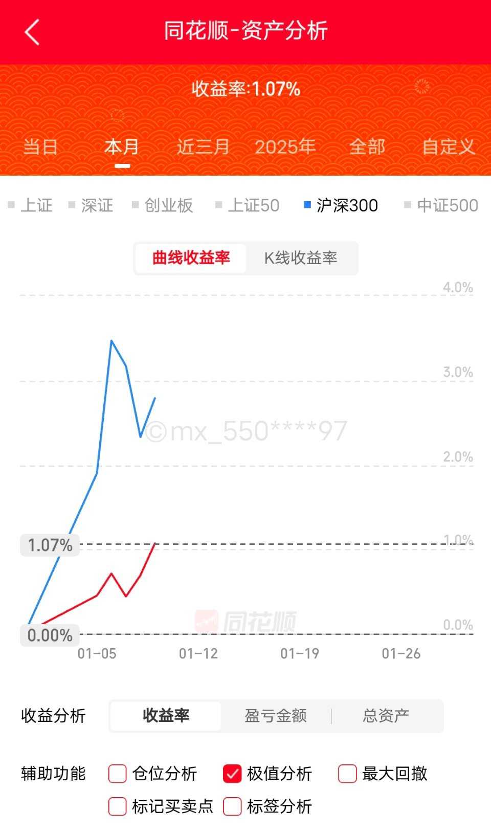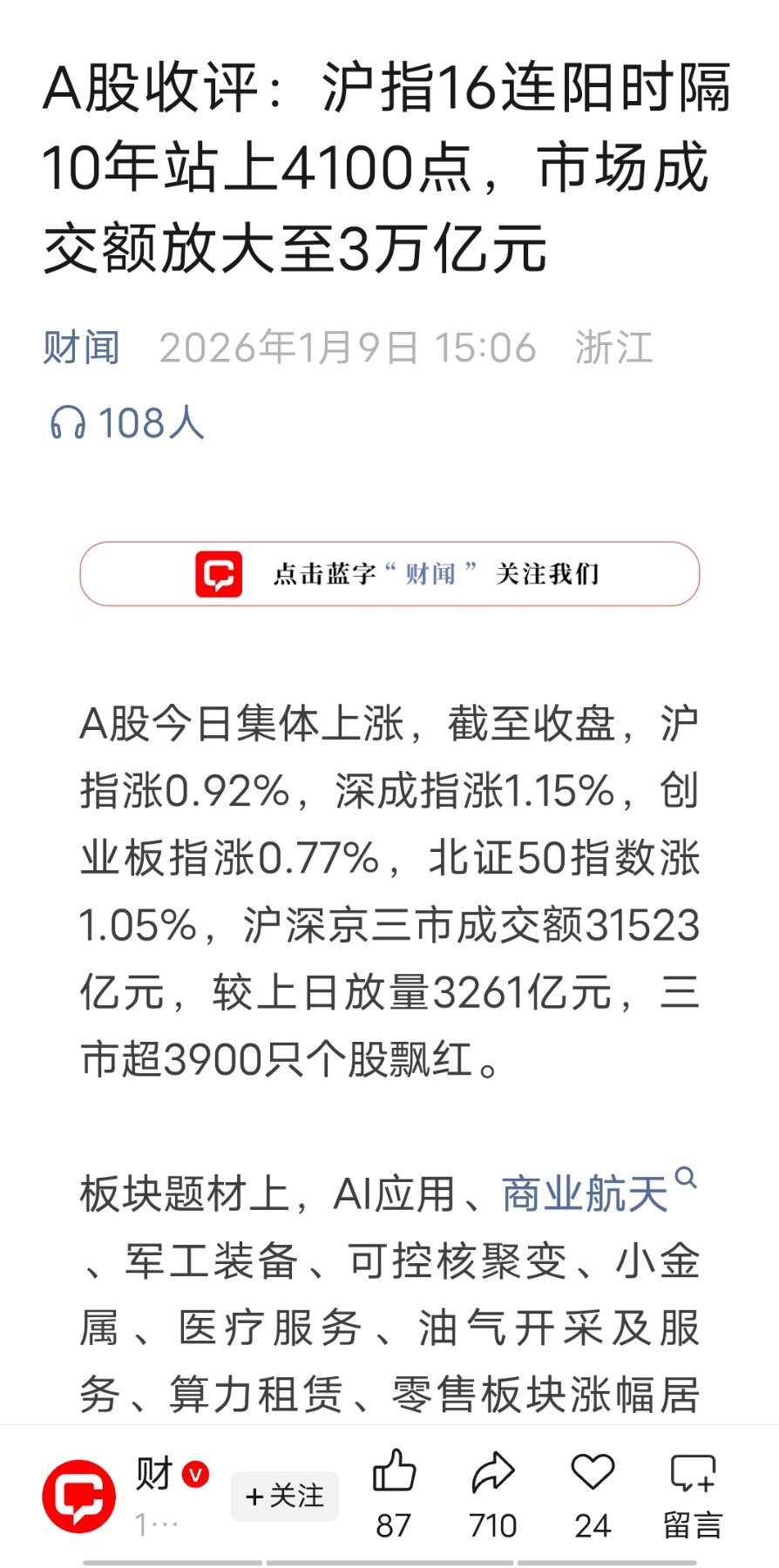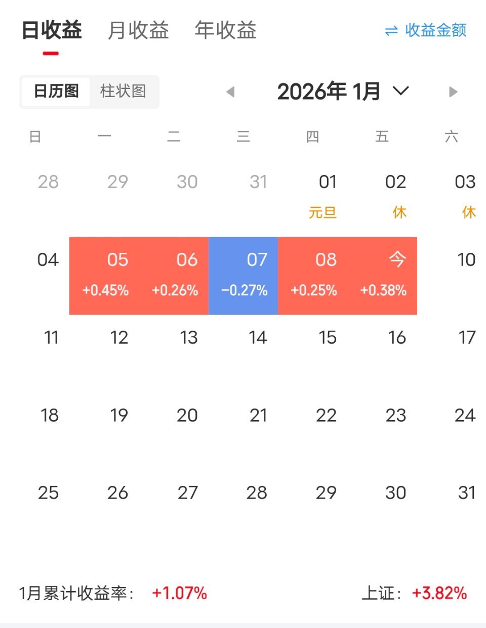 2026年第一周,远远跑输大盘。上证指数16连阳,站上4100点,太丧心病狂了第一周,我情绪不高。不是因为跑输大盘,而是没有满仓作为满仓爱好者,没有满仓,浑身难受。但大盘一路拉涨,我是想等下跌加仓的。希望一月下旬给机会吧。1月下旬会有业绩预告,市场会回调一波吧。很多年没有这么猛的1月,太不习惯。1月份大涨的板块,也要小心一点,情绪过高,事后容易砸坑。a股实现16连阳今日看盘