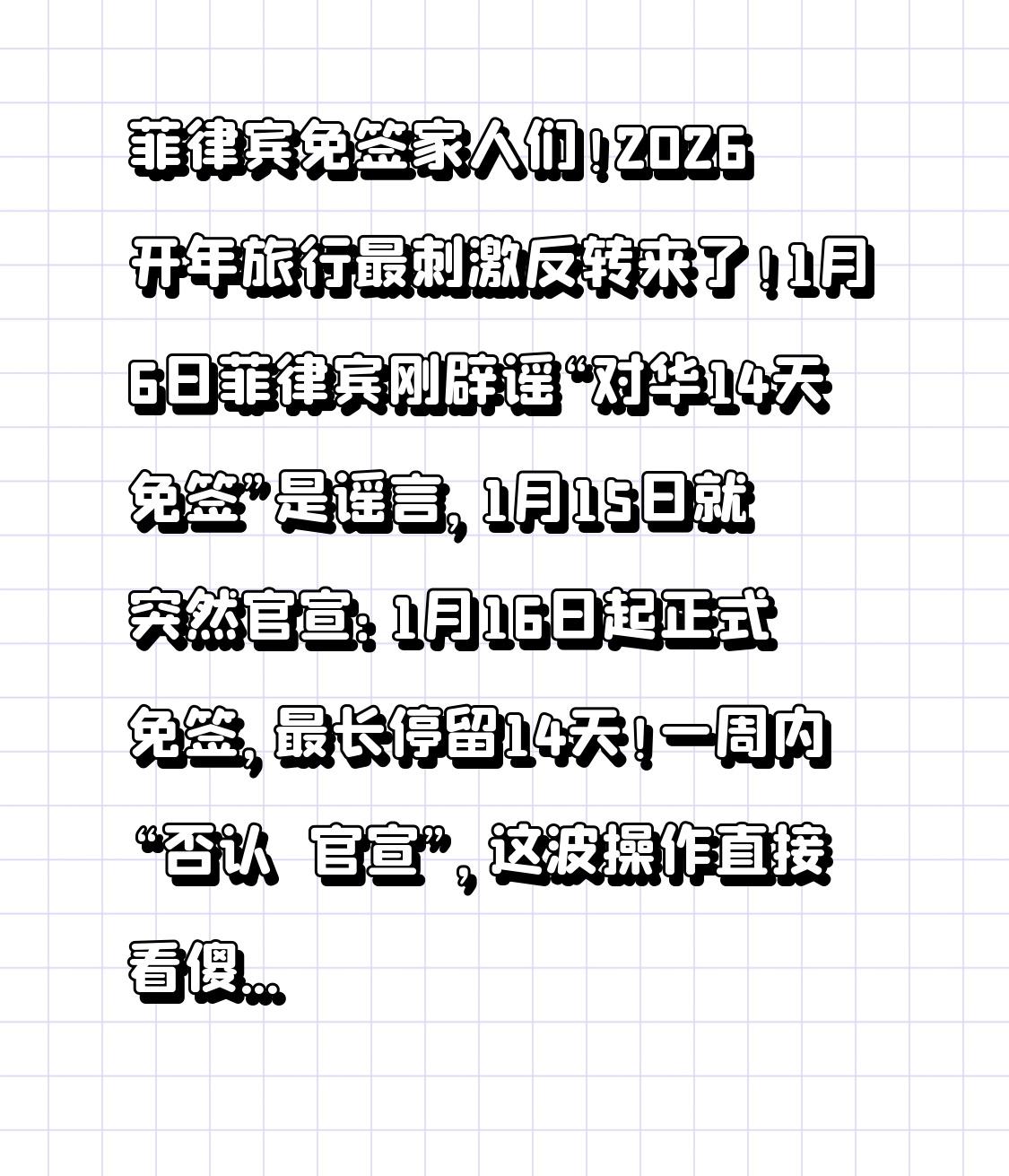 菲律宾免签 家人们!2026开年旅行最刺激反转来了!1月6日菲律宾刚辟谣“对华14天免签”是谣言,1月15日就突然官宣:1月16日起正式免签,最长停留14天!一周内“否认→官宣”,这波操作直接看傻网友,到底是福利还是套路?揣上护照就能走?8个必看规则,少一个都可能被海关拦下! 先理清政策真相,别被旧消息坑了!这次是菲律宾外交部1月15日正式发文,不是谣言!和之前的“有条件7天免签”完全不同:不用美加澳日申根签证,只要是中国普通护照,就能直接免签入境,停留14天仅限旅游或商务,不可延期、不可转签。但关键限制藏在细节里,第一个坑就是入境口岸——仅限马尼拉和宿务两大机场,想从其他口岸进,免签政策根本没用,跑错了直接白跑! 更让人意外的转折来了:看似“说走就走”,实则6个硬门槛缺一不可!第一,护照有效期必须超6个月,差一天都可能被拒,出发前赶紧翻护照;第二,必须带纸质版返程机票+酒店订单,电子档存手机备份,海关会逐人核查,订单信息和行程对不上直接遣返;第三,出发前72小时要在Etravel系统填信息,生成QR码截图保存,没这码连登机口都进不去;第四,现金要带够,海关随机抽查,每人至少500美元或等值比索,只带信用卡没用,不够钱会被怀疑非法打工;第五,入境时别乱说话,海关问出行目的,只说“旅游”,别提找朋友、商务洽谈超纲内容,言多必失;第六,曾有菲律宾逾期滞留史、姓名和黑名单重名的,建议提前办贴纸签,不然大概率被拦! 避开这些坑,14天刚好把菲律宾精华玩个遍!海岛控直接冲长滩岛+薄荷岛:在长滩岛踩“面粉级”白沙滩,傍晚坐落日风帆追橘子海;薄荷岛打卡巧克力山、和眼镜猴贴贴,还能夜探萤火虫森林,像闯入《阿凡达》秘境。喜欢小众玩法的,从宿务出发去奥斯洛布和鲸鲨同游,墨宝邂逅沙丁鱼风暴,随手拍都是刷爆朋友圈的大片。吃货更别错过:烤乳猪外皮酥脆流油,海鲜拼盘现捞现做,街头芒果冰沙10块钱吃到撑,中档餐厅人均50+,性价比比三亚还高! 其实大家期待免签,不就是想少点繁琐流程,来一场说走就走的旅行吗?不用熬夜填签证材料,不用等审批,周末+年假就能凑够14天,逃离寒冷和内卷,去海岛拥抱阳光椰林。但自由的前提是合规,提前摸清规则、备齐材料,才能丝滑入境不添堵。 2026年的旅行清单,菲律宾必须安排上!现在刷到就是赚到,赶紧转发给旅行搭子规划行程~ 评论区说说,你最想冲哪个海岛?是去潜水还是纯躺平?关注我,下期分享菲律宾14天详细行程+当地避坑指南,带你花最少的钱玩遍千岛之国!