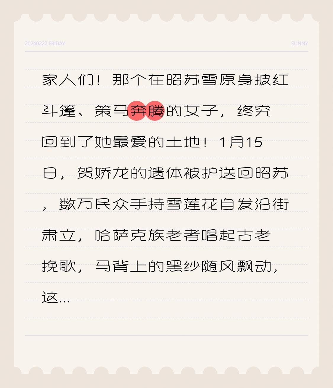 家人们!那个在昭苏雪原身披红斗篷、策马奔腾的女子,终究回到了她最爱的土地!1月15日,贺娇龙的遗体被护送回昭苏,数万民众手持雪莲花自发沿街肃立,哈萨克族老者唱起古老挽歌,马背上的黑纱随风飘动,这场跨越山海的送别,看哭了无数人! 谁能想到,那个永远精力充沛的“马背上的副县长”,会以这样的方式告别。1月11日,她在博乐市为农产品直播做前期拍摄时意外坠马,头部严重受伤。尽管国内顶尖专家全力抢救,还是没能留住她,1月14日深夜,贺娇龙永远闭上了眼睛,年仅48岁。 但这不是故事的终点,而是她一生奉献的缩影。很多人只记得2020年那场爆红——零下20度的雪原,她借来红斗篷,骑着伊犁天马疾驰,6亿播放量让昭苏这个边疆小城被全国熟知。可很少有人知道,爆红背后是她20多年的扎根:从基层教师到副县长,她卷起裤腿和牧民挖渠,暴风雪夜送物资,为了助农直播,清晨8点开播到凌晨1点,一年跑遍21个城市推广特产。 最让人泪目的转折,是她爆红后的清醒。直播间百万打赏全捐公益,直播带货分文佣金不取,有人质疑她“作秀”,她直言“普通人就不配努力吗”;有人说她“红了就飘”,她却依然奔波在田间地头,连人带马摔进河中只为拍摄“天马浴河”。她总说:“我们读书不是为了摆脱家乡,而是让家乡摆脱贫困”,这句话成了她一生的写照。 如今她魂归昭苏,数万民众的送别早已说明一切:牧民骑马挂黑纱绕行草原,广东网友专程赶来吊唁,曾受她帮扶的单亲妈妈带着孩子哭红了眼,缺席最后一次拍摄的摄影师自责“没能保护好她”。灵车经过她曾推动建设的“彩虹公路”,车辆纷纷鸣笛致哀,这条路像她的一生,短暂却绚烂。 遵照她的遗愿,骨灰将安葬在昭苏高坡,面向草原与雪山。没有豪华墓冢,只有简单石碑,可她留下的远比这些珍贵:带动数千万元农产品销售,让昭苏游客暴增,更点燃了无数人建设家乡的希望。那个说要“让昭苏的美像彩虹一样被看见”的女子,最终化作了彩虹的一部分,永远守护着这片土地。 贺娇龙的故事告诉我们,真正的网红不是流量堆砌的假象,而是扎根大地的坚守;真正的英雄,不是惊天动地的壮举,而是日复一日的奉献。她用一生诠释了“龙马精神”,也让我们明白,总有人为了家乡的美好,拼尽了全力。 此刻昭苏的雪还在下,可她点燃的希望之火永远不会灭。评论区说说,你是因为什么认识贺娇龙的?让我们一起送别这位边疆女儿,愿她在天堂没有奔波,只有安宁。关注我,记住这个温暖又勇敢的名字,也记住这份为家乡拼搏的赤诚!