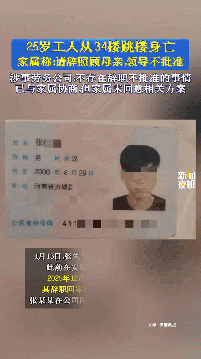 痛心!12月27日,安徽芜湖,25岁小伙从34楼坠楼身亡。只因要辞职回家照顾生病的母亲,但申请多次公司却不批准,而且误工一天要罚三天工资。所在公司说:跟劳务中介签的合同;劳务中介说:没有不批!网友说:劳务外包得好好管管了! 2025 年 12 月 27 日的深夜,在一栋 34 楼的高层住宅里,25岁的河南小伙张某某从楼上一跃而下,生命就此停在了本该最有希望的年纪。 噩耗很快传回了老家,张某某的母亲本就身患脑梗,半边身子偏瘫,常年卧床,生活完全不能自理,听到儿子出事的消息,她当场昏厥过去。 62 岁的父亲顾不上悲痛,连夜坐车赶到芜湖,可等他见到的,却只有冷冰冰的遗体,还有彼此推责任的相关人员,没有一句能让人安心的解释。 事情的根子,其实早在两个月前就埋下了。 张某某在芜湖安瑞光电有限公司当操作工,是 2024 年通过老乡介绍过来的,表面上他是在工厂干活,实际上合同却是跟另一个公司签的,属于典型的劳务外包员工,人不直接归厂里管,出了事,责任就容易被来回踢。 2025 年 10 月,老家突然打来电话,说母亲突发高血压和脑梗,抢救过来后留下了严重的偏瘫后遗症,吃喝拉撒都得人照顾。 家里没别人能顶上,作为唯一能撑事的孩子,张某某心急如焚,第一时间就去找车间主管,说要辞职回家照顾母亲。 可这一步,并没有想象中顺利,主管当场没同意,说现在人手紧,没人能接替他的岗位,之后两个多月里,张某某前前后后提了五六次辞职,每一次得到的回应都差不多,不是“再等等”,就是“现在真走不了”,别说辞职了,就连请假回家几天看看母亲,也不被允许。 更让人喘不过气的,是车间里那条大家都心知肚明的“规矩”,误工一天,就要扣三天工资。 这个说法虽然没写在明面上,但工友们都知道是真的,谁也不敢轻易缺勤,对张某某来说,这不仅是钱的问题,更是精神上的压迫。 张父后来回忆,12 月 24 日那天,他和儿子还通了电话,他劝儿子赶紧回来,家里实在撑不住了,张某某在电话那头沉默了好一会,说现在没人接班,走不了,只能先撑着,还给父亲转了 5000 块钱,让家里先用着。 谁也没想到,这竟成了父子之间的最后一次通话,短短三天后,派出所的电话就打到了家里。 出事前的细节,也让家属越想越难受,事发当晚 8 点 11 分,张某某还和车间主管有过一次 15 秒的微信语音通话,而从 12 月 19 日开始,这名主管就多次把张某某的微信删除,双方沟通本就不顺畅,那通简短的语音之后没多久,悲剧就发生了。 事情出了以后,家属连夜赶到芜湖,可让他们寒心的是,公司这边没有负责人出面,前来对接的只有劳务中介公司,中介方面表示,愿意给 28000 元作为丧葬费用,这个数字一说出口,家属当场就炸了,一个好端端的年轻人没了,难道就值这点钱? 更让人愤怒的,是双方说法完全对不上,张某某的姐夫张先生四处找工友取证,好几个同事都表示,张某某确实多次提出辞职被拒绝,误工扣三天工资也是车间里公开的“老规矩”。 可当记者联系到主管王某时,对方却一口否认,说从来没有不让张某某请假、辞职,还称所有请假条都收集齐了,已经交给公司。 劳务中介那边也紧跟着撇清责任,称“不存在辞职不批的情况”,还说已经和家属沟通过,只是没谈拢条件。 一边是工友们的集体证言,一边是公司和中介的全面否认,真相到底在哪,谁都说不清。 更让人心凉的是,家属去公司门口讨说法,却连门都进不去,一连十多天,始终没见到公司真正负责人。 “我们不是来讹钱的,就想弄明白,为什么不让他辞职,为什么这种规定没人管?”张先生说这话时,满是无力和愤怒。 事情传到网上后,迅速引爆舆论,很多网友直言,这样的用工方式简直像“卖身契”,也有人指出,“误工一天扣三天工资”本身就站不住脚,更别说连辞职都不让。 不少人吐槽劳务外包的套路:出了事,企业推给中介,中介再推回企业,最后倒霉的永远是员工。 目前警方已经初步排除了他杀的可能,家属对死因本身没有异议,但在赔偿和责任认定上,依然没有结果。 25 岁,本该有无数种可能,却因为一份辞不掉的工作、一些不合理的规定,戛然而止。 这起悲剧,既是对企业和劳务公司的警醒,也是在提醒所有打工人:合法权益不是摆设,遇到违法扣工资、不让辞职的情况,一定要留证据、走仲裁、走法律途径,千万别一个人硬扛。 工作再重要,也没有命重要。 愿张某某能安息,愿他的母亲有人照料,家属最终能等来一个公正、说得过去的结果,每一个靠双手讨生活的人,都不该被这样对待。 对此你怎么看? 信源:新黄河