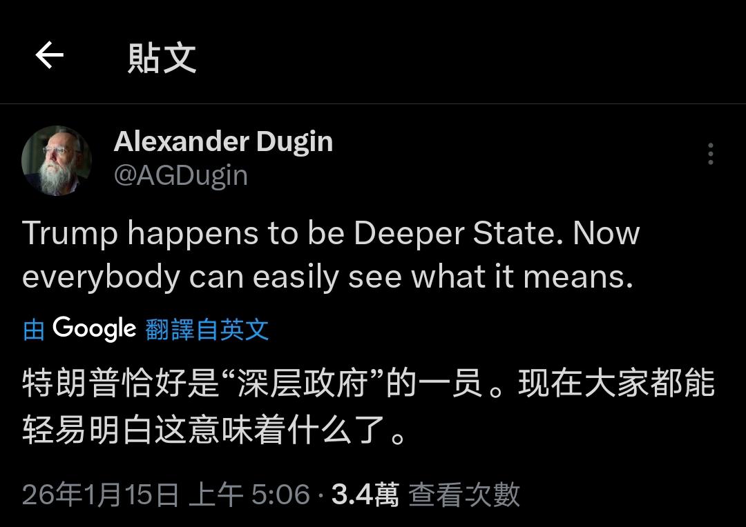 杜金这“deeper”一词,简直封神啊! 杜金一句“更深层政府”,简直是把特朗普的底裤扒得干干净净! 选前有多会演,选后就有多跋扈——之前吼着“消灭深层政府”,把自己包装成美国人民的大救星,仿佛要替天行道掀翻暗箱。可上任才一年,真面目彻底暴露: 对内搞关税大棒,硬生生把物价推得飞涨,不管民众死活;对外更是搅得全世界鸡犬不宁,跨洲轰炸说炸就炸,跨国绑架说绑就绑,嚣张跋扈到全世界谈 “川” 色变,而他半点道德负担都没有。 以前建制派当政,不管是民主党还是共和党执政,就算作恶,好歹还要块“民·主·”“自·由·”的遮羞布,用一堆虚伪的价值/借口包装自己的行为,所以,他们是“深层政府”。 特朗普呢?完全不演了!一副“恶霸本霸归来”的作派,作恶全凭心情,连伪装都懒得装。不再躲在暗处搞阴谋,而是光明正大打劫,比传统深层政府更祸害、更难搞! 这可不就是“更深层政府”吗? 而杜金大师“deeper state”这一精绝的用法,绝对够他扬名立万了!! 地缘政治博弈地缘观察杜金国际政治 Source: X