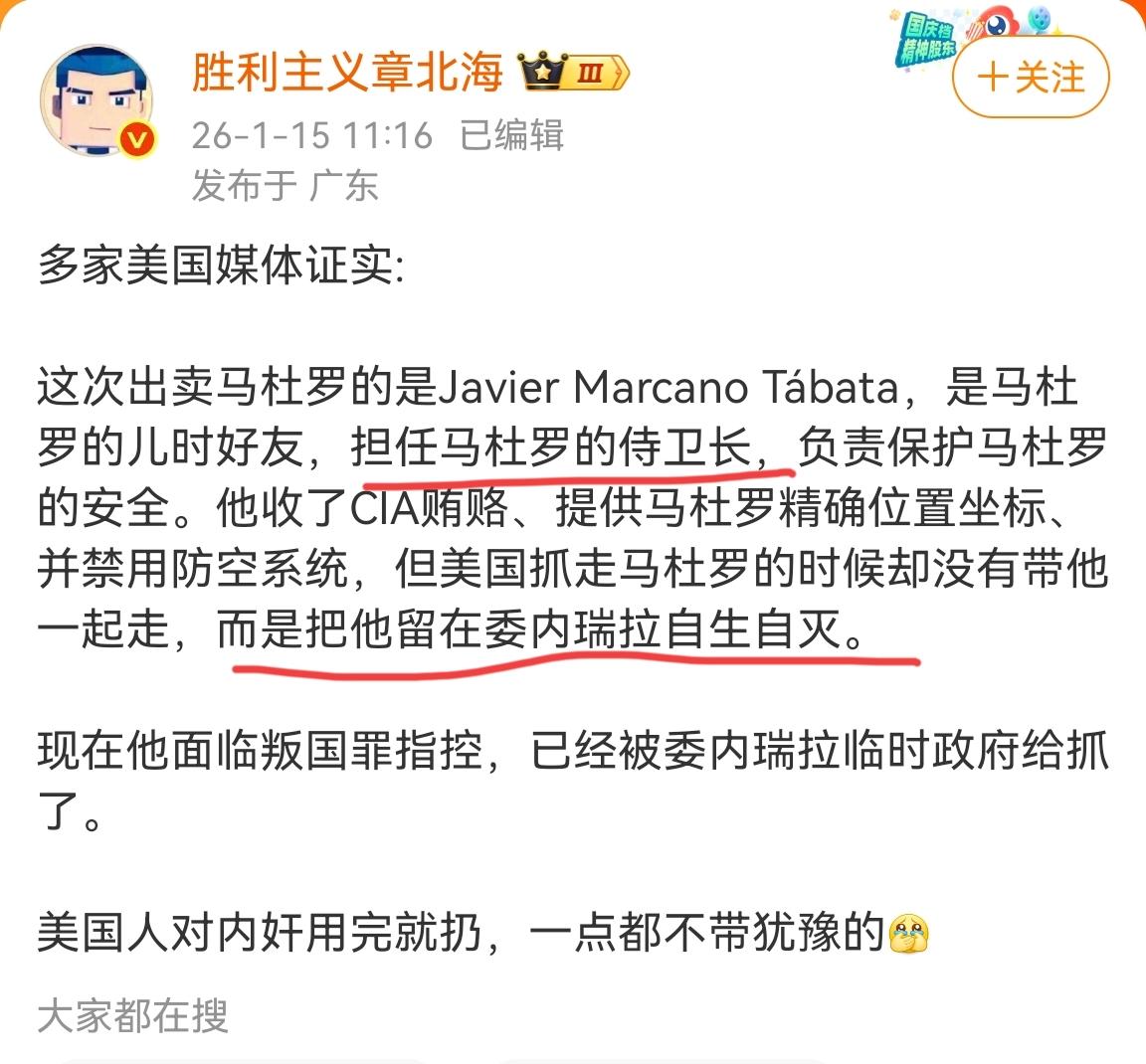 老美真是太损了,美媒证实出卖马杜罗的是担任他侍卫长的儿时伙伴。 但老美出了一个损招,那就是在完成任务后并没有把他一起带走,导致他现在被委政府抓捕随时面临叛国罪的指控。 要知道老美当时可是悬赏了5000万美元,估计这侍卫长也就拿了一点订金,这下老美尾款都不用付了。 侍卫长还是太年轻,老美的千万美元悬赏不是那么好拿的。 大家可以查查有人成功过吗?