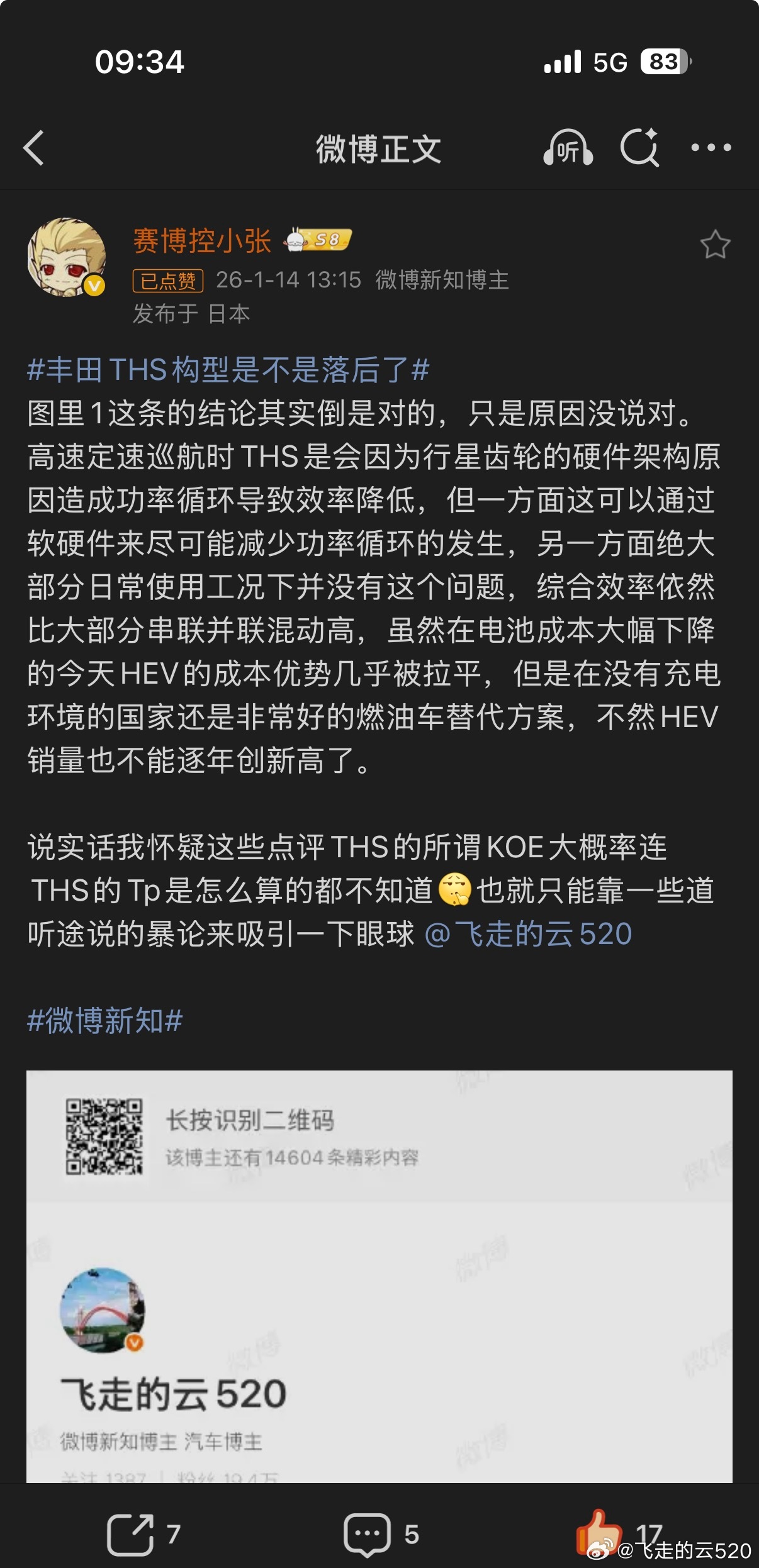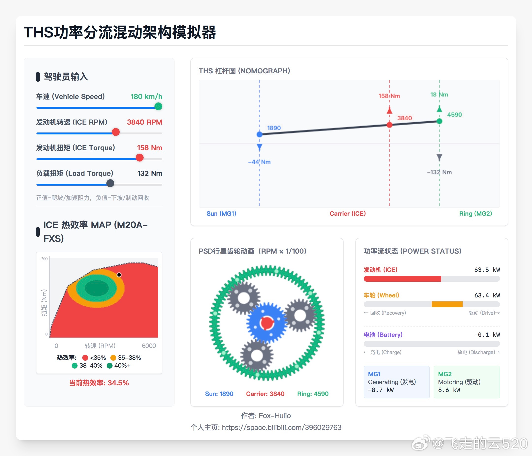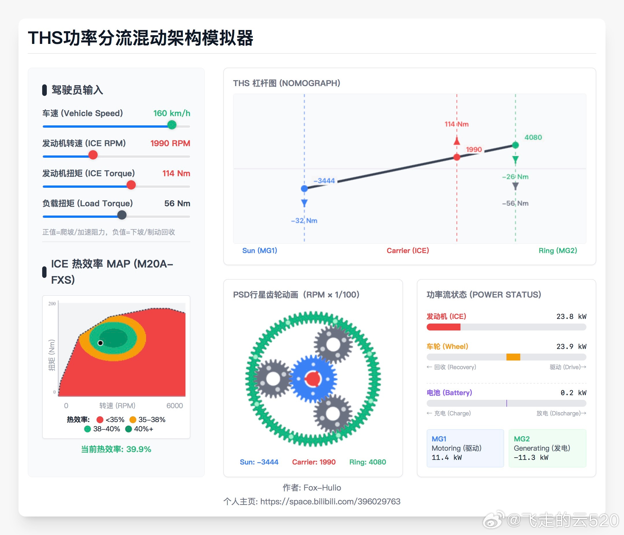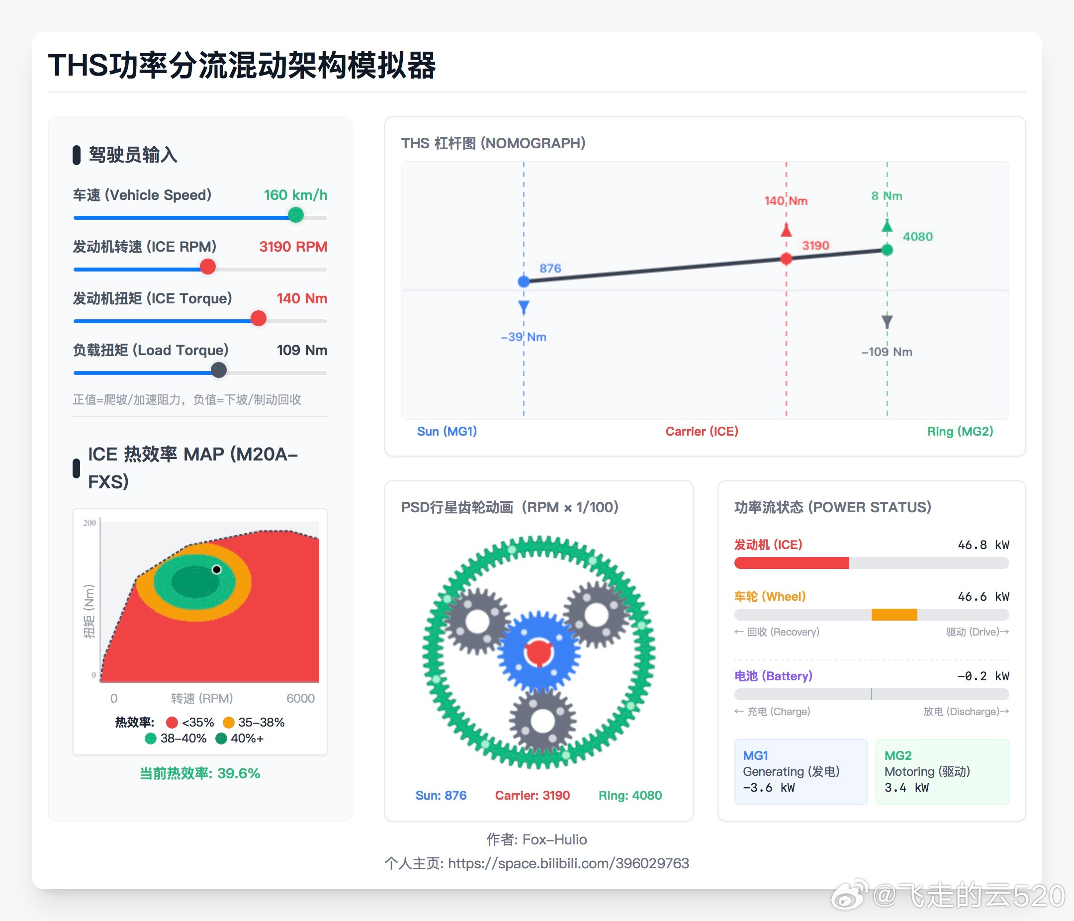 丰田THS构型是不是落后了昨天我的评论出错了,也算是刻板印象了,我误以为丰田THS的功率循环大约会出现在160km/h以上。在此更正一下多年来一直有一种说法:“丰田THS高速存在功率循环”,这种功率循环会导致丰田THS在高速状态下效率偏低。真正模拟计算一下,才能发现这个说法多么荒谬,从历史来看,可能是最早期THS电机电控性能孱弱时代流传下来的目前的THS早就没有这个缺点了图1是我模拟计算的160km/h巡航下,发动机、两台电机的工作状态。此时挑选了比较合适的发动机工况:3190rpm、140nm,此时和轿车的驱动功率需求基本相等。从图1右下角的MG1发电功率3.6kw、MG2驱动功率3.4kw可以看出来,此时机械传动比例大约92%,也并没有出现功率循环的情况图2又计算了180km/h的工况,从右下角的电机功率状态也可以看得出来,依然没有功率循环。机械传动比例依然高达86%那么到底有没有可能出现MG1驱动,然后动力传递到齿圈上的MG2,MG2再把这部分功率转换成电能,从而形成功率循环呢?存在的,图3模拟计算了160km/h下坡的工况,这时候驱动功率需求比正常循环小得多。如果这种工况将发动机工况选择在最高效的状态,从杠杆图可以看到MG1的转速转变为负,与扭矩同向,就成为驱动电机。从图3右下角可以看到,MG1在驱动,MG2在发电。此时电能在两个电机之间循环了但因为功率并没有超过发动机功率,等同于发动机功率有52%为机械传动,48%为电传动。因为电传动比例更高了,所以传动效率会有下降。对应的单档并联系统,则几乎只能通过降低发动机扭矩或大功率充电的方式来匹配功率需求。发动机效率会大大低于功率分流,或充电损耗大大高于功率分流。机械传动越接近100%,传动效率越高。但实际运行中,还需要考虑发动机的工况点,综合计算效率后作出工况选择。电传动比例达到100%,就近似于串联、增程了。哪怕是如此极端的工况,也没有出现电机循环功率大于发动机功率的情况。所以,现在的丰田THS几乎不会出现电功率大于发动机功率的功率循环。几乎全速域的效率都不会低于单档串并联。图4里面的描述其实只是多年来大家的误解,亲自算一下,才能真正理解THS的精妙和弱点。而不是以讹传讹感谢的提醒,大家关注一下,这位是资深THS车主和各种工况收集大师。