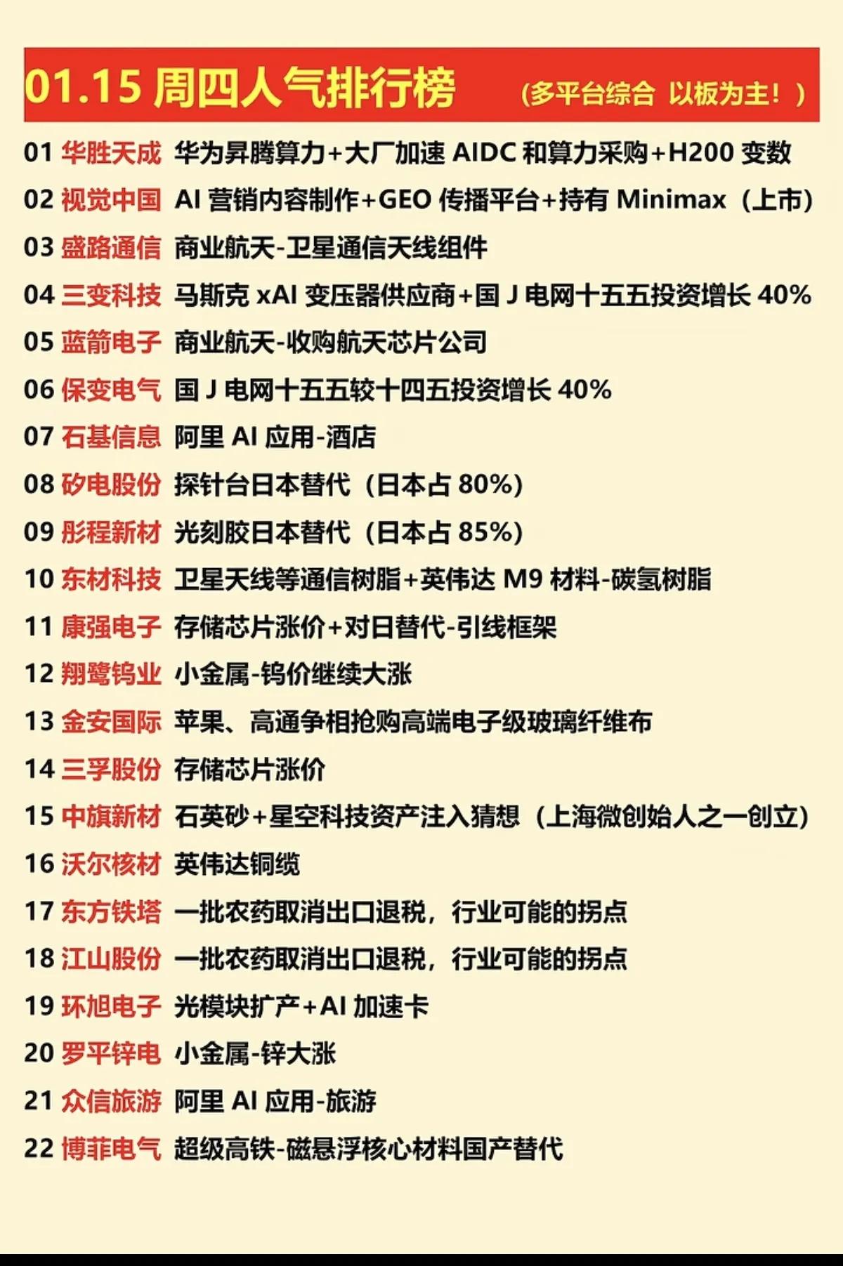 1月15日,周四A股人气排行榜!!! 今日,A股走势一般,华胜天成今日录得一字板,华为概念叠加AIDC概念,后市值得高看一眼;视觉中国,AI营销概念叠加GEO概念,后市值得重点关注;盛路通信,商业航天板块叠加卫星通信天线组件,后市值得期待!!!