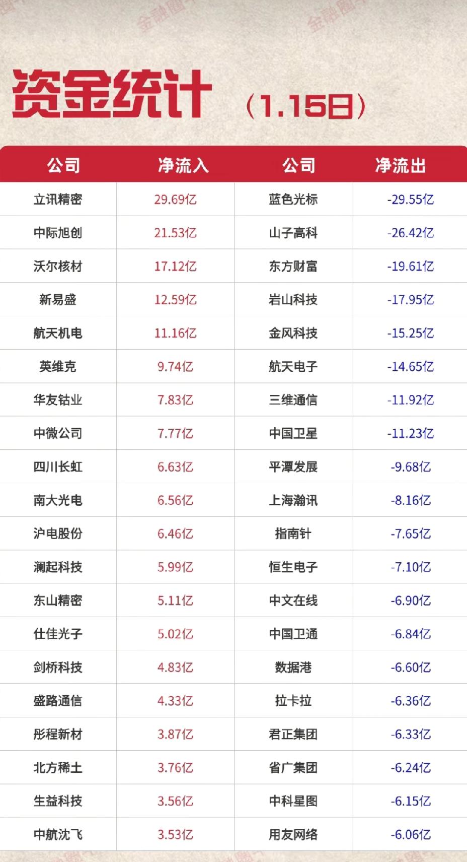 1月15日,周四A股主力资金流入流出一览表!!! 今日,A股市场情绪一般,成交量缩水,立讯精密今日资金大幅流入超29亿,中际旭创、沃尔核材、新易盛、航天机电主力资金流入均超10亿;蓝色光标主力资金净流出超31亿,山子高科、岩山科技等前期涨幅较大股票纷纷回调!!!