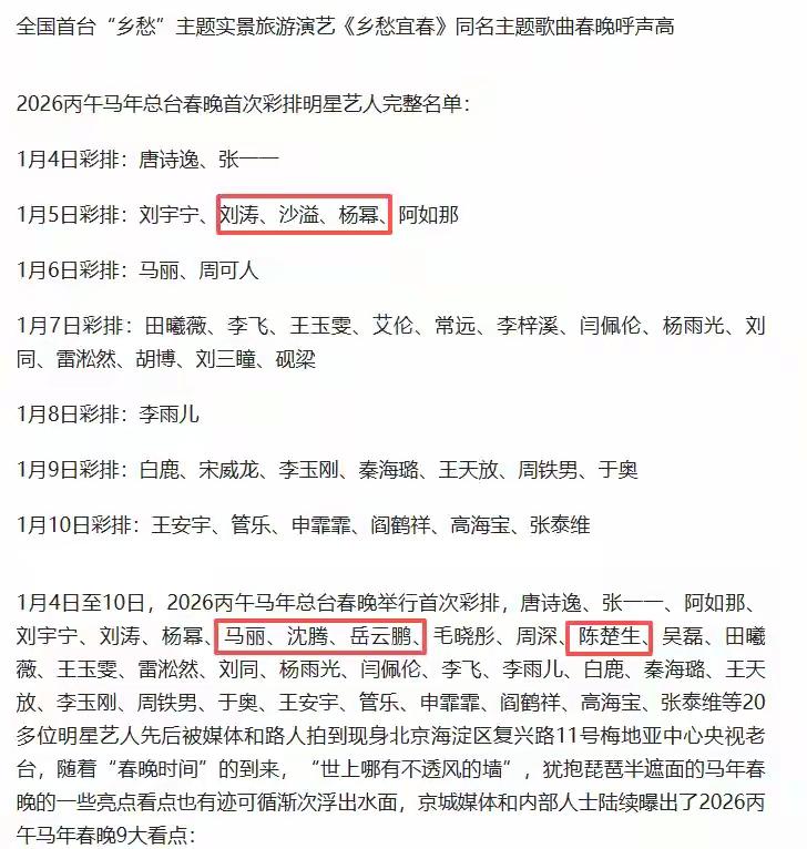 2026马年央视春晚首次彩排名单曝光!沈腾马丽第十次合体、王伯昭朗诵《马赋》、刘谦携大鹏柳岩献魔术,杨幂、周深等群星齐聚。曾坦言“被骂怕不上春晚”的岳云鹏现身彩排,打破传闻,引发网友热议。 网友评论: 最不愿意看到岳云鹏那张扁僵脸! 刘谦不是参拜过靖国神社怎么还能上春晚 为什么不请刀郎老师 当年春晚的一首歌可以红遍大江南北,一个小品家喻户晓,现在呢? 不论怎么折腾。南方人已经很少有人看春晚了,