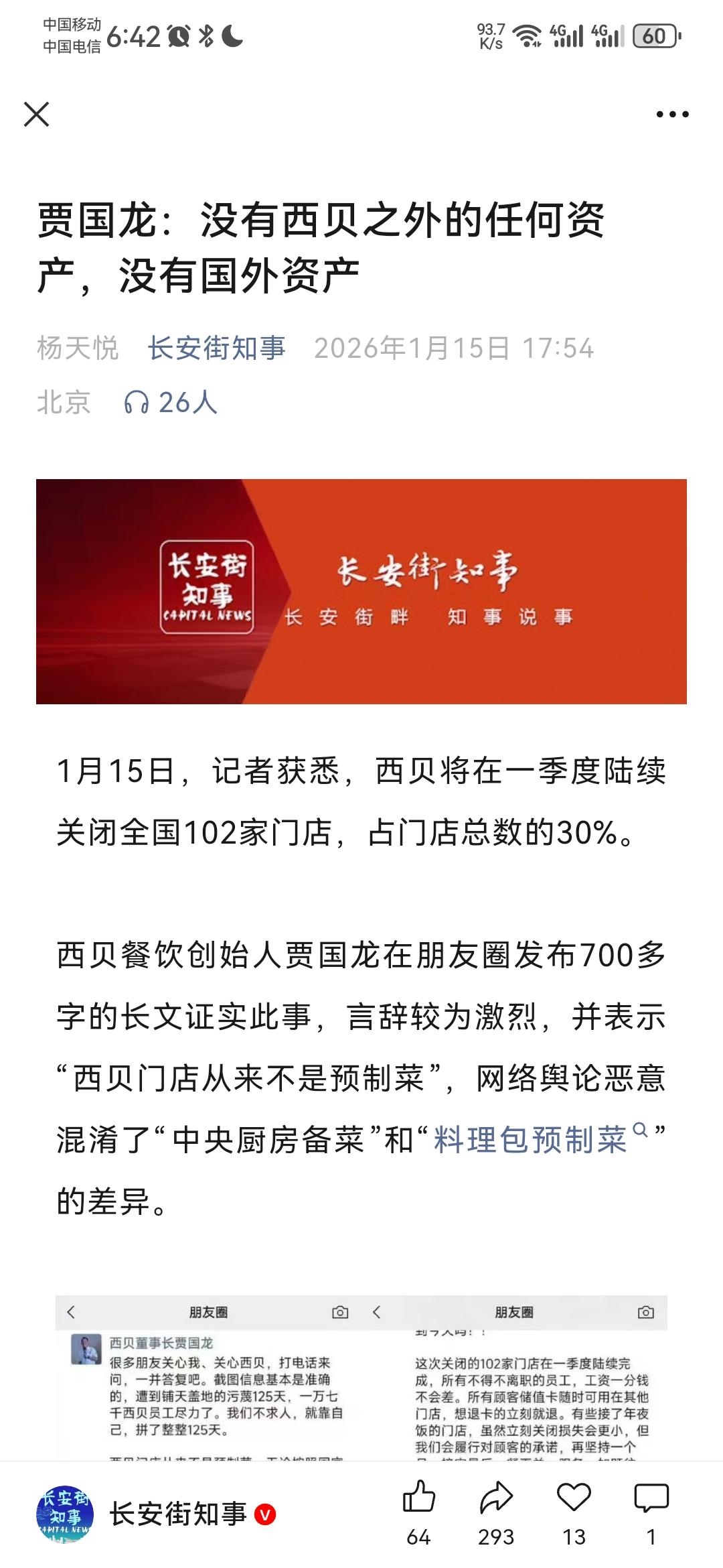 贾国龙在朋友圈发七百字长文回复了,言辞激烈!长安街知事1月15日报道说,西贝将陆续关闭102家门店,占其总数30%,贾国龙在自己朋友圈证实了此事,同时,这一次贾国龙再一次言辞激烈,一方面否认西贝是预制菜,另一方面不点名炮轰罗永浩。 首先是否认西贝是预制菜,贾国龙以非常自信的语气说:“西贝门店从来不是预制菜,无论按照国家定义还是现实生活常识!”之前贾国龙就说,西贝门店100%没有预制菜,这一次他的观点一如既往,还是嘴硬认为西贝没有预制菜。 其次则是不点名炮轰罗永浩,直接以非常激烈的语气说:“网红恶意混淆‘中央厨房备菜’和‘料理包预制菜’的差异,恶意污蔑‘急冻保鲜有机西兰花’,恶意污蔑品质好和进价高的草原羊食材。”认为西贝现在所遭遇的负面舆论,都是被污蔑、被扭曲的才发生的。 接着,贾国龙则是直接说,他就是不懂公关,“我是一个踏踏实实做了38年实业,带领一万七千人为顾客做服务的人,我为什么要懂公关?是不是这个世界上不会诡辩的普通人就会该被欺辱?”愤懑之情溢于言表。 最后,贾国龙则是谈及闭店相关的事务,说虽然闭店了,但是在闭店之前,西贝仍旧会工作好,会服务到最后一刻,员工的所有工资都会结清,之前在西北充值了优惠卡的顾客,卡里的钱也会全额退款,同时说西贝还会继续拼,“争取活下来”。 看完贾国龙的这一篇朋友圈长文,心中不得不叹息,贾国龙似乎直到现在,依旧没有认清自己的问题,依旧还是那么固执,不肯承认自己的错误,西贝之前暴露出来的问题太多了,消费者们都是亲眼见到的,在这里贾国龙却是全盘否认。 同时,在这种情况下,他竟然还是要“硬钢”,矛头直指罗永浩。 还非常委屈非常愤懑,感觉自己不懂公关又如何?为什么大家都不满意?实际上,如果西贝的菜肴真的质量好,味道好,就算是有人故意抹黑,能黑得动吗?并不是贾国龙不会公关,而是西贝真的存在现实的问题,西贝的很多忠实消费者都多次反映过了,认为西贝这些年菜肴的份量不断减小,价格不断增加,同时味道也在不断变差,这都是现实存在的、无可回避的问题。 贾国龙这一次估计真的是急了,西贝的结局也令人叹息,作为一个餐饮人,贾国龙这一次的应对依旧是负分,如果贾国龙还是这样固执的态度,那么接下来西贝的命运是要打一个问号的。 无论如何,还是希望贾国龙能够真正认识到自己的错误,踏踏实实改正,西贝作为一个经营多年的品牌,走到现在也不容易,西贝的没落,无论如何也是一个遗憾,贾国龙如果能够痛定思痛,那么西贝还会有一点希望,可如果还是如此,未来真的难料。 总之,祝愿西贝能改正自身、踏实做好吧。