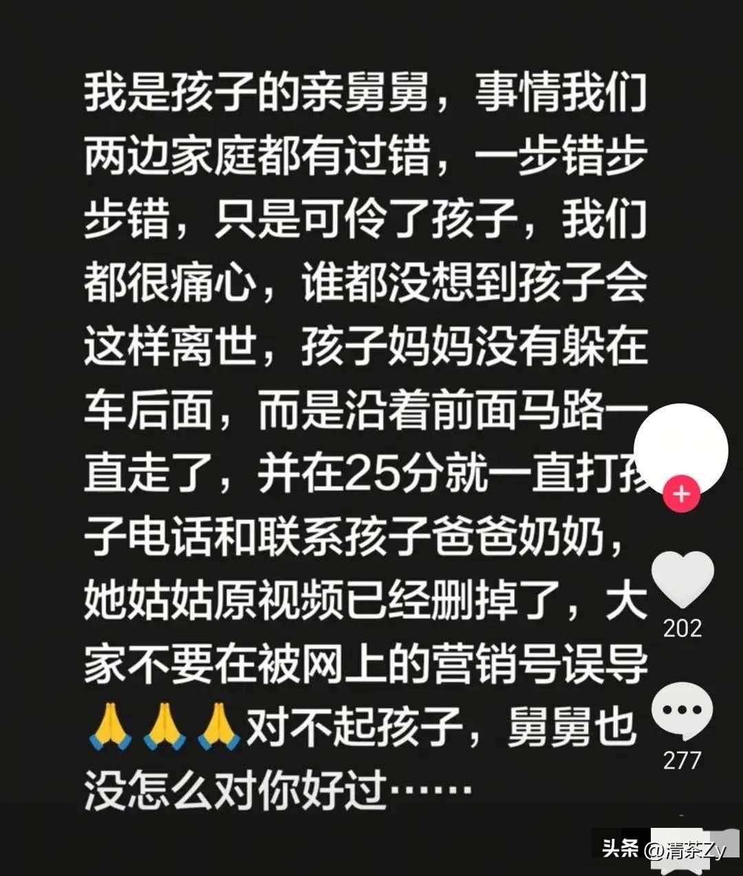 女儿刚离开两天,爸爸就着手办理死亡赔偿金的相关手续了! 妈妈把9岁女儿送到奶奶的麻将馆门口,女儿不想让妈妈离开,妈妈哄了她一个多小时,并答应她下周末还会接她出来玩! 妈妈离开后并没有躲藏起来,而是快步的离开了! 虽然离开了,但妈妈一直都不放心,在回家的路上联系了孩子的爸爸和奶奶,也一直在和孩子联系!孩子的爸爸看定位认为孩子已经回家了! 谁也不知道最终会酿成悲剧!就像孩子的舅舅所说:两边家庭都有过错,只是可怜了孩子! 如果妈妈把孩子交到奶奶的手上,奶奶别让孩子离开自己的视线,多安慰一下孩子!或许悲剧也不会发生! 女孩离世两天后,她的爸爸就在办理着死亡赔偿金的相关手续!还问孩子妈妈对这个保险份额的分配是否同意!这么急着办理手续未免让人感觉太冷血了! 父母离婚孩子成了牺牲品!女孩以这样的方式离开太让人心疼了!愿宝贝往生极乐 再无烦忧!