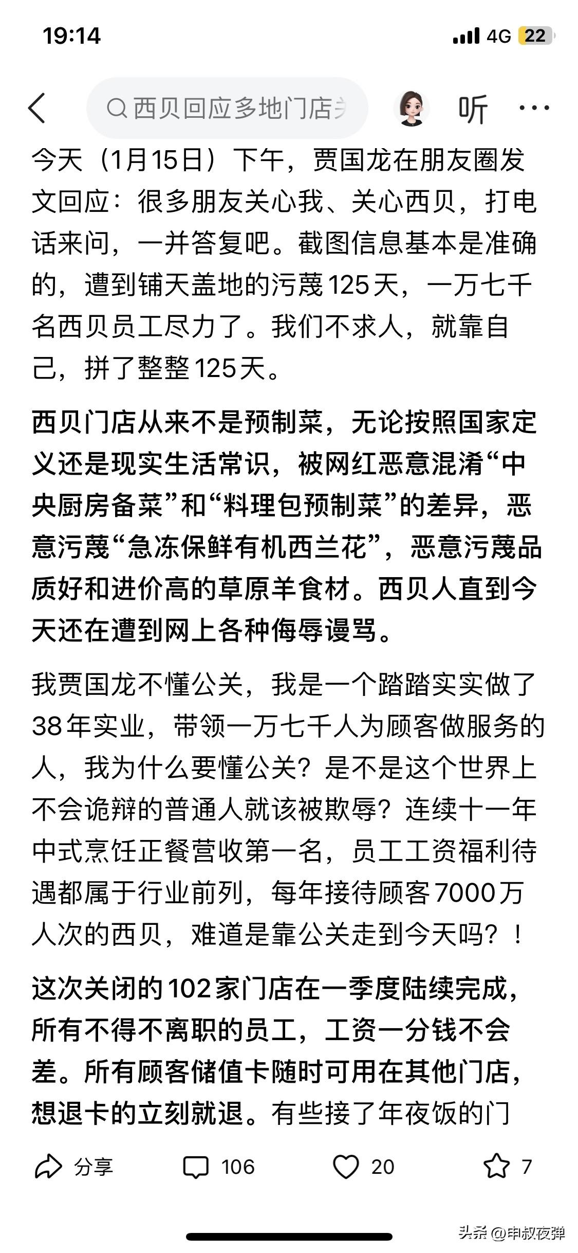 西宝贝贾老板性格和人品看来有点问题。明明是看餐饮大形势不好顺势关闭1/3门店,转身就一口咬定是被网络造谣恶劣攻击造成经营困难,硬是绑架上万员工的生计,意思潜台词就是因为被罗永浩指出就是预制菜还不承认,打死不承认,但是导致员工失业是你罗永浩的责任,轻松实现缩减规模转移矛盾。会哭的孩子有奶吃,用就业捆绑,搞不好可以拿到一笔扶持补贴。话说贾老板最气的是上市还没完成。不然,哈哈哈。