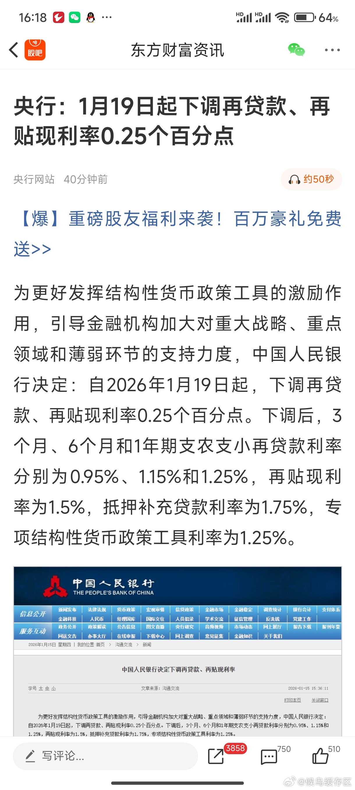 央行:1月19日起下调再贷款、再贴现利率0.25个百分点