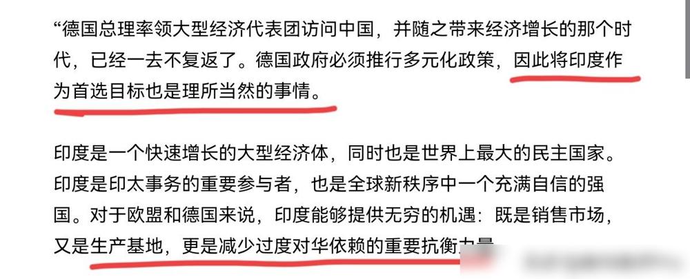 德媒表示,中国已经不是德国在亚洲最为重视的国家,印度成为了德国最优先的新伙伴!最近德国总理梅尔茨首次亚洲之行选了新德里而非北京,德媒说这是德国对外经济战略的重大转折。 这事怎么看?作为普通网民,我觉得国家外交布局有自己的考量,德国可能想拓展新市场,或者分散经济依赖。但咱们看合作不能只看“首访”这种姿态,得看实际数据。2024年中德贸易额2018.8亿美元,是印德贸易额(334亿)的6倍还多;德国对华投资超百亿,对印投资才4.3亿——这些硬数据,比“谁优先”更有说服力。 中德合作这么多年,从汽车到化工,从技术到市场,早就形成了深度互补。德国需要中国的大市场和完整产业链,咱们也需要德国的高端制造经验。就算德国现在更重视印度,中德之间的共同利益摆在这里,该合作还是会合作。外交姿态会变,但务实合作的基础不会轻易动摇。