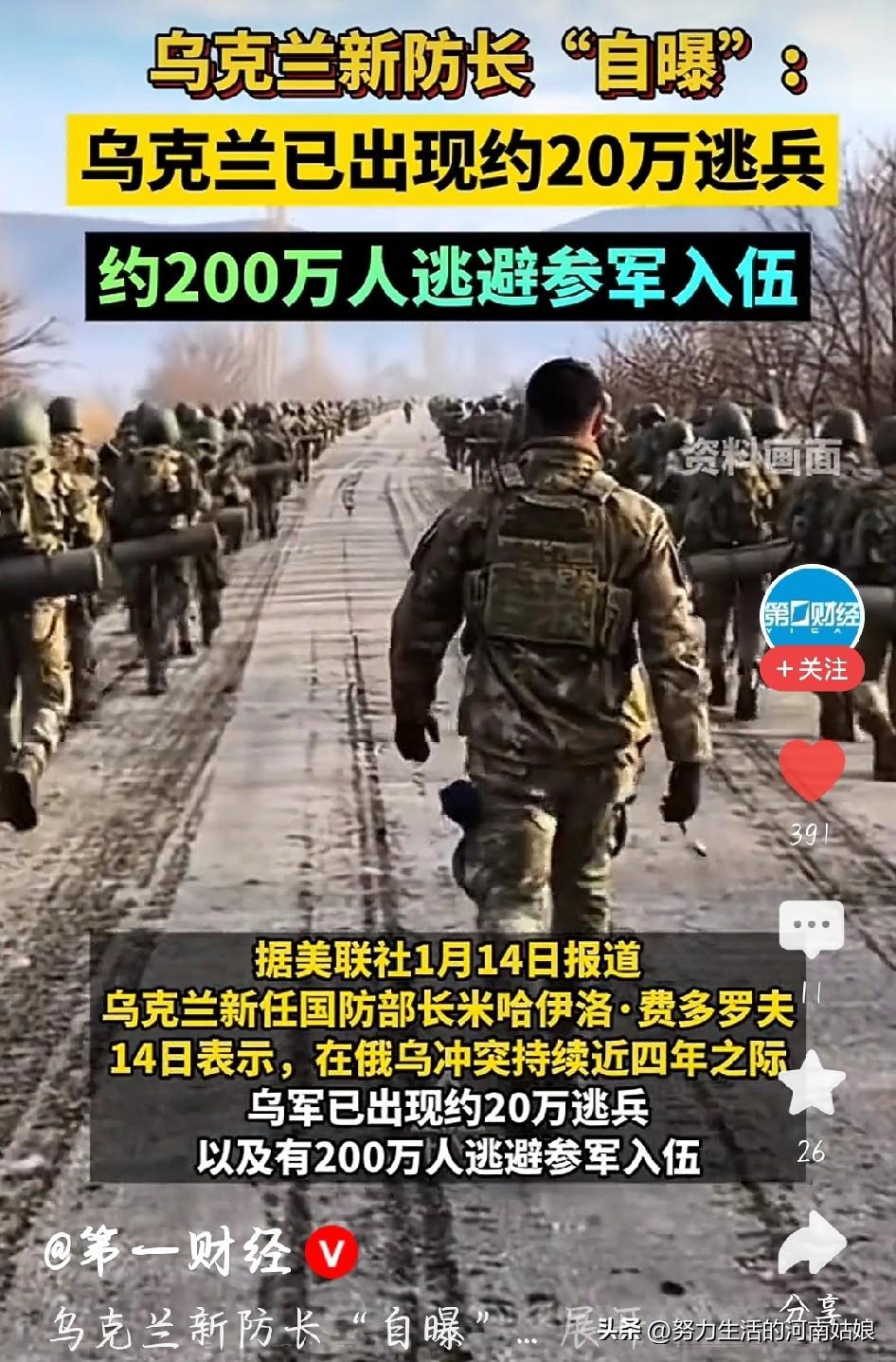 乌克兰新防长这话一出口,真是惊掉下巴!军中居然有20万逃兵,还有200万人干脆逃避参军,这数字太吓人了。 打了快四年仗,士兵们早熬不住了。新兵没好好训练就被推上前线,装备跟不上,补给也费劲,上战场跟送命没两样。更可气的是,军队里还有腐败,指挥官中饱私囊,对士兵还动粗,谁愿意卖命啊? 说白了,大家不想当炮灰!一边是没完没了的战事,一边是看不到头的希望,逃兵多也不奇怪。和平才是真刚需,再这么耗下去,受伤的还是普通老百姓。乌克兰问题 乌克兰人口问题 乌克兰征兵 乌军逃兵人数 乌克兰逃兵潮 乌拒服兵役 乌克兰新防长:军中已出现20万名逃兵 图片截图于网络