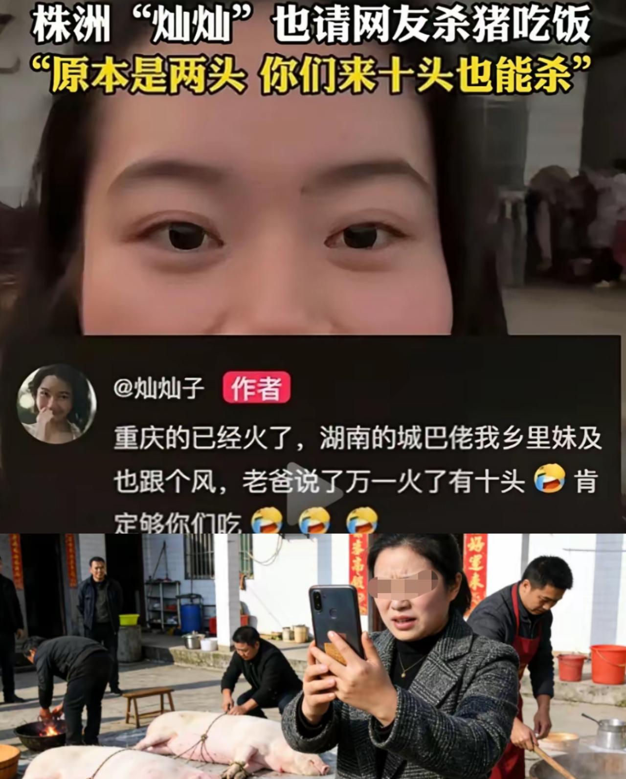 果不其然,湖南灿灿的刨猪宴翻车了! 湖南灿灿今天当众哭了,离她原定计划18号才正式开始的刨猪宴还差3天,已经办不去了。 她说原因很简单,自己没什么社会经验,一时口嗨,在网上喊了一嘴,外加自家场地太小了。 让报名还没来的,不要来了,但在路上的她仍会接待,这和她前几天筹办刨猪宴的时候,简直是两个态度。 明眼人能看出来,不是准备的18头猪不够吃了,而是不给她推流了,她直播间被封,当地媒体也由开始的争相报道,到后来的删除视频。 没有大金主打底帮忙,单靠她自己,来个几千号人吃席,连续吃几天,普通家庭一年都白干,亏不起。 湖南灿灿是有心造作刨猪宴,重庆呆呆是无意善心求助,出发点不一样,一个是喊人帮忙,一个是喊人吃饭,一个是因为自己家要杀两头猪过年用,一个是纯纯蹭流量。 毫无掩饰带有目的性的这种人,注定走不远,所以灿灿找个理由取消了刨猪宴,流量有蹭到,粉丝也涨了,这波她也不亏,哭就没必要了。 为了一夜暴富不择手段,想走捷径,出现了热点有利可图就拼命往里面挤,没有诚信和底线,她哭惨,不只是累和对不住大家,更多的是没有变到现吧! 湖南猪宴 湖南灿灿能超越呆呆的流量吗