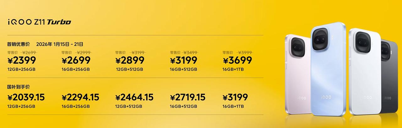 iQOO Z11 Turbo价格来了!大家感受下 12+256GB 2399;国补2039.15 16+256GB 2699;国补2294.15 12+512GB 2899;国补2464.15 16+512GB 3199;国补2719.15 16+1TB 3699;国补3199