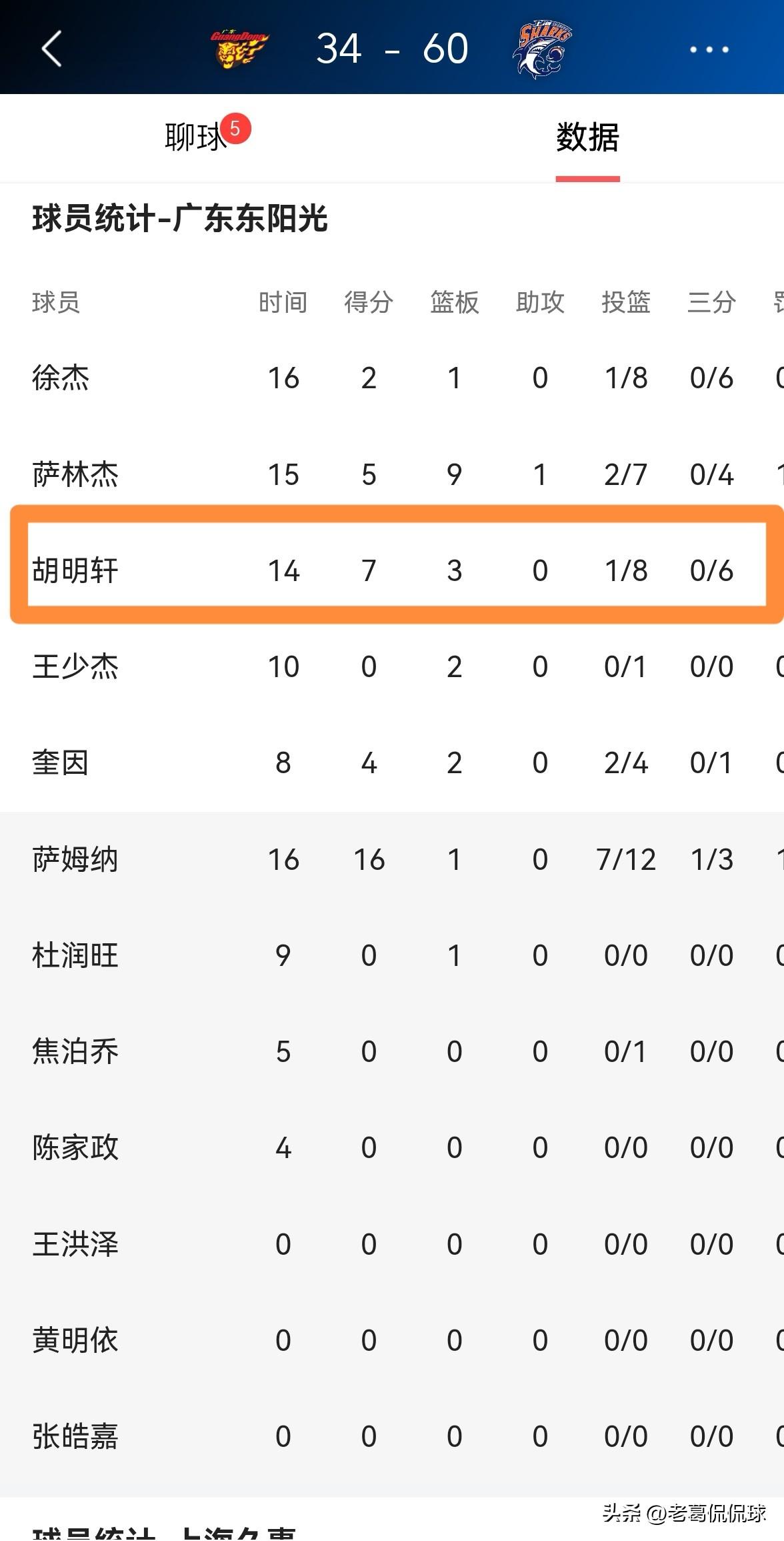 我必须要好好夸夸广东东阳光球星胡明轩!在今天进行的广东东阳光和上海久事的比赛中,目前双方半场战罢,广东东阳光以34:60落后于对手。在前两节比赛中,胡明轩首发出战14分钟,投篮8中1,其中三分球6中0、罚球6中5得到7分3篮板1抢断1盖帽,没有出现失误和犯规,他的场上正负值为-18。 虽然胡明轩和徐杰一样手感冰凉,但是我还是要称赞胡明轩,因为胡明轩在手感冰凉的情况下努力冲击篮下造犯规帮助球队,此外胡明轩在防守端的投入度也很高。