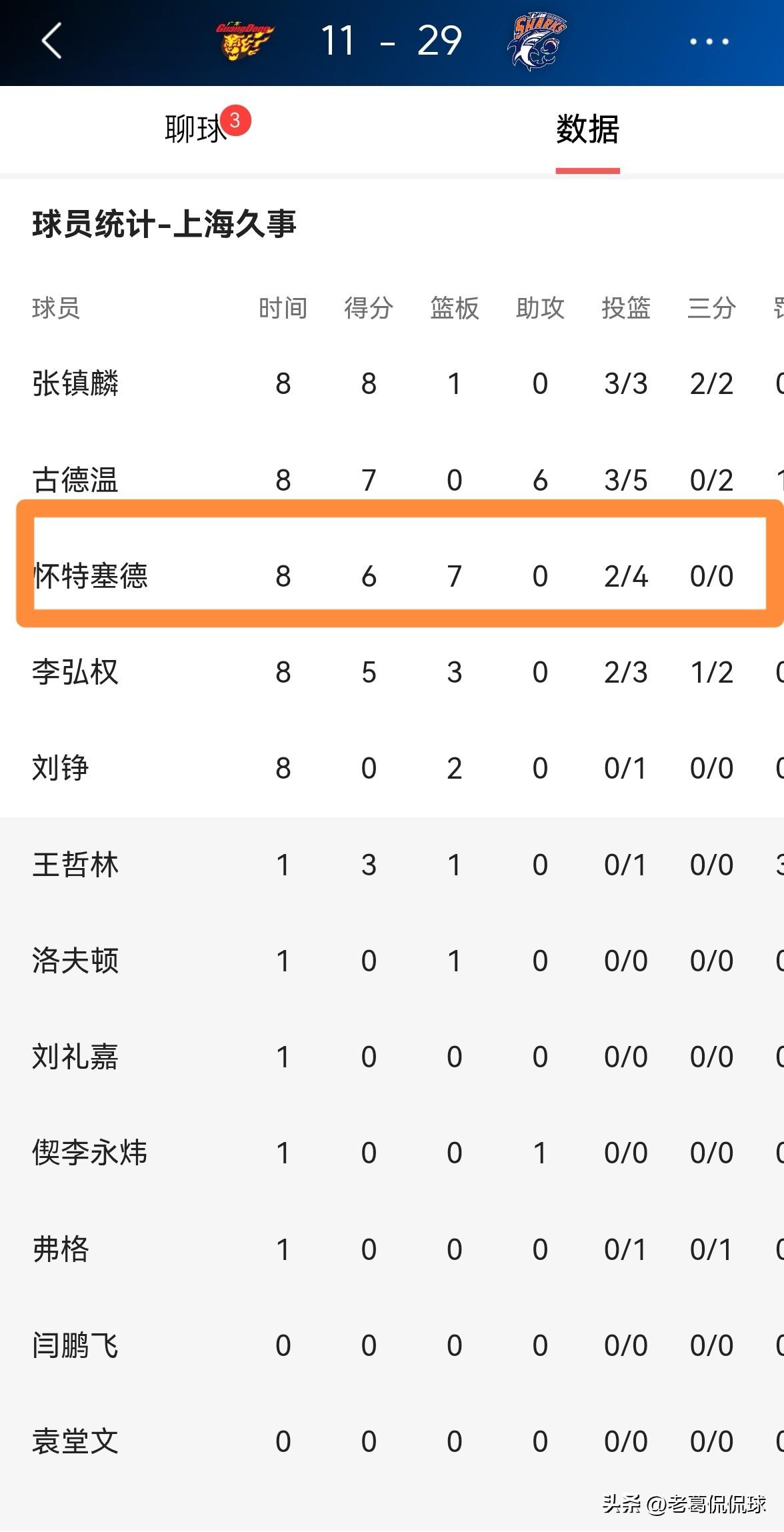 上海久事外援怀特塞德真是彻底的开挂了!在今天进行的上海久事和广东东阳光的比赛中,目前双方的首节比赛已经结束,上海久事在客场以29:11领先对手,形势看起来非常美妙。 值得一提的是,在第一节比赛中,怀特塞德真是梦回巅峰,他在首发出战的8分钟里,投篮4中2,其中罚球2中2得到6分7篮板2盖帽,没有出现任何的失误和犯规,他的场上正负值为+20。 值得注意的是,在第一节比赛中,当怀特塞德镇守篮下的时候,广东东阳光的得分手一次次的无功而返。