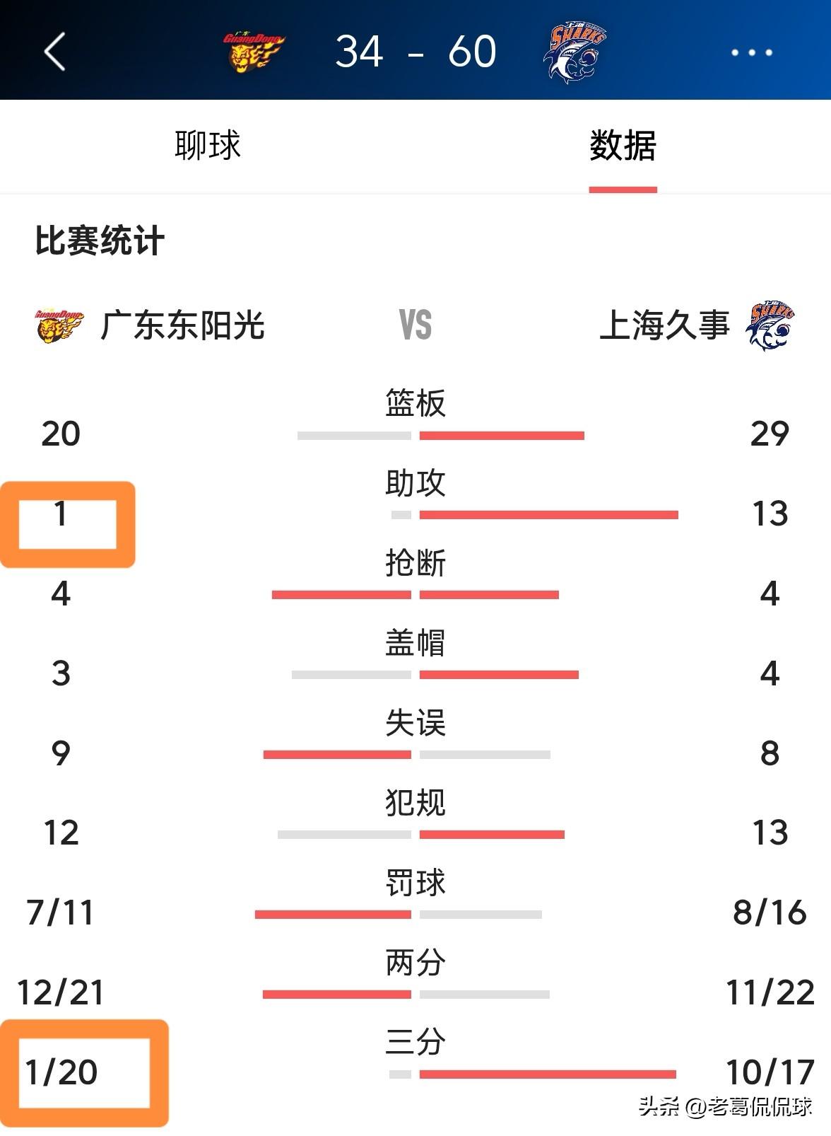 广东东阳光真是让人失望透顶!在今天广东东阳光主场迎战上海久事的比赛中,目前双方半场战罢,广东东阳光以34:60落后对手26分,基本上败局已定了。在前两节比赛中,广东东阳光在三分线外集体失准,球队三分球20中1,三分球命中率仅有可怜的5%,而上海久事的三分球17中10,两支球队在三分球命中率方面差异巨大。 我相信广东东阳光的主场球迷是最受煎熬的,他们万万没有想到球队会被对手打得落花流水。