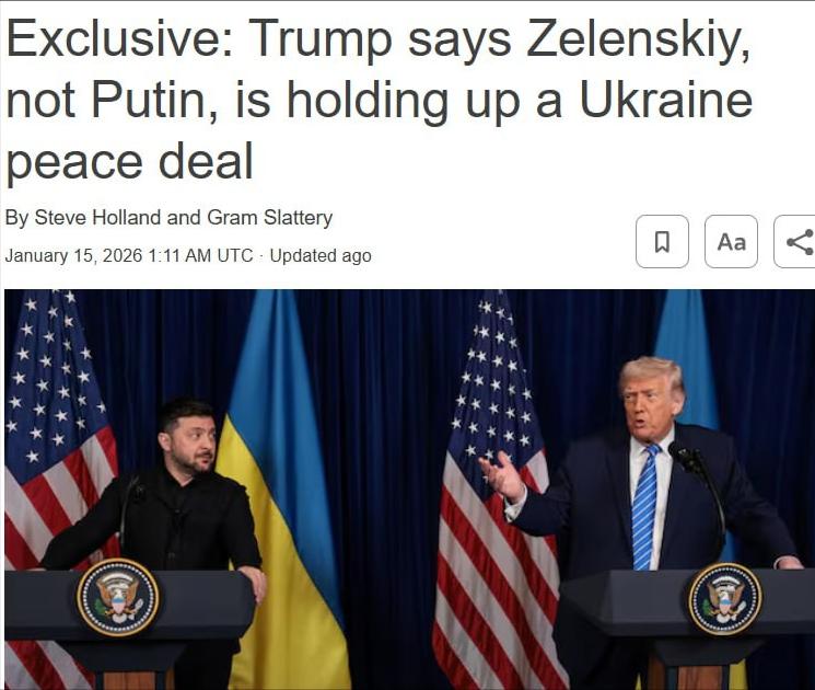 达成协议的主要障碍是泽连斯基:特朗普的风向又变了 特朗普近日在路透社独家采访中的表态,再次将俄乌冲突的和平谈判焦点引向了乌克兰总统泽连斯基。这位向来表态反复的美国前总统直言,泽连斯基才是达成和平协议的主要障碍,还强调普京已经准备好签署协议,暗示美方需要推动泽连斯基做出妥协。 这番言论来得突然,却也让外界对其摇摆不定的立场多了几分琢磨,毕竟此前他既批评过普京,也指责过泽连斯基,如今这般针对性的批评,显然是又换了一套论调。 这场持续近四年的冲突,早已让俄乌双方陷入疲惫,战场局势的胶着也让和平诉求愈发迫切。俄罗斯舆论研究中心的民调显示,多数俄罗斯民众预计冲突会在2026年结束,泽连斯基此前也表态有望在今年上半年终结战事,双方看似对和平有共识,却始终卡在谈判桌上难以推进。 特朗普此番将矛头指向泽连斯基,并非毫无铺垫,他在总统任期内就一直试图介入俄乌冲突,还曾许下一天内结束战事的竞选承诺,只是这份承诺从未兑现,如今转而将责任推给乌方,难免让人猜测其背后的考量。 更值得关注的是,克里姆林宫很快对特朗普的说法做出了回应,发言人佩斯科夫明确表示同意这一观点,称情况的确如此,还强调俄方对解决冲突持开放态度,美乌双方都清楚俄方的立场。这一回应让局势更添微妙,原本处于对立的美俄,在指责泽连斯基这一点上形成了罕见的默契。 而这份默契背后,藏着各自的利益算计。特朗普一直想通过介入俄乌冲突彰显自身外交能力,尤其是在选举背景下,尽快促成和平协议无疑是加分项,而俄罗斯则希望借助美方压力打破谈判僵局,推动乌方在领土等关键问题上让步。 特朗普的表态也与欧洲盟友的论调形成了鲜明反差。此前英国、法国曾与乌克兰签署意向声明,承诺若俄乌达成和平协议,将向乌克兰部署部队,这一举措遭到俄罗斯的强硬反对,明确表示西方在乌军事单位将成为合法打击目标。 欧洲各国试图通过军事承诺为乌克兰撑腰,而特朗普却急于推动乌方妥协,这种分歧背后,是美欧在俄乌问题上的利益差异——欧洲担忧冲突持续影响自身安全与能源供应,却也不敢轻易得罪乌克兰,而美国则更想通过掌控和平进程,拿捏俄欧双方的筹码。 事实上,俄乌谈判的阻碍远不止泽连斯基一人,领土划分、乌克兰安全保障、北约东扩等问题,都是难以逾越的鸿沟。美方此前抛出的28点“和平计划”经过多次修改,仍无法弥合各方分歧,泽连斯基提出的20点和平计划草案,也未能获得普遍认可。 特朗普口中“普京准备好签署协议”的说法,更像是一种外交话术,毕竟普京此前已明确表示,俄罗斯要么和平收复所有声称拥有的土地,要么武力夺回,不可能在核心利益上让步。 更有意思的是,特朗普与泽连斯基的互动本就充满变数。去年12月,两人曾在海湖庄园会晤商讨和平计划,今年达沃斯世界经济论坛期间,双方也有望再次会面,甚至可能签署涉及乌克兰战后重建的协议,协议背后还牵扯着美国对乌克兰矿产资源的开发诉求。 一边是公开指责泽连斯基阻碍和平,一边又在私下洽谈合作,特朗普的操作让人难以捉摸,也让人好奇他所谓的“迫使泽连斯基妥协”,究竟是施压还是利益交换。 这场持续四年的冲突,早已让俄乌民众饱受苦难,和平固然值得期待,但建立在妥协与利益交换之上的和平,能否真正持久?特朗普反复摇摆的立场,究竟会推动冲突走向终结,还是让局势更加混乱? 克里姆林宫的表态是否意味着俄方真的做好了让步准备,泽连斯基又会如何应对来自美方与俄方的双重压力?这些问题,或许只有时间能给出答案,但可以肯定的是,俄乌和平的主动权,从来都不掌握在某一个人手中,而是藏在各方的利益博弈与妥协之中。 你认为特朗普此番表态背后的真实目的是什么,俄乌冲突今年能迎来和平曙光吗?