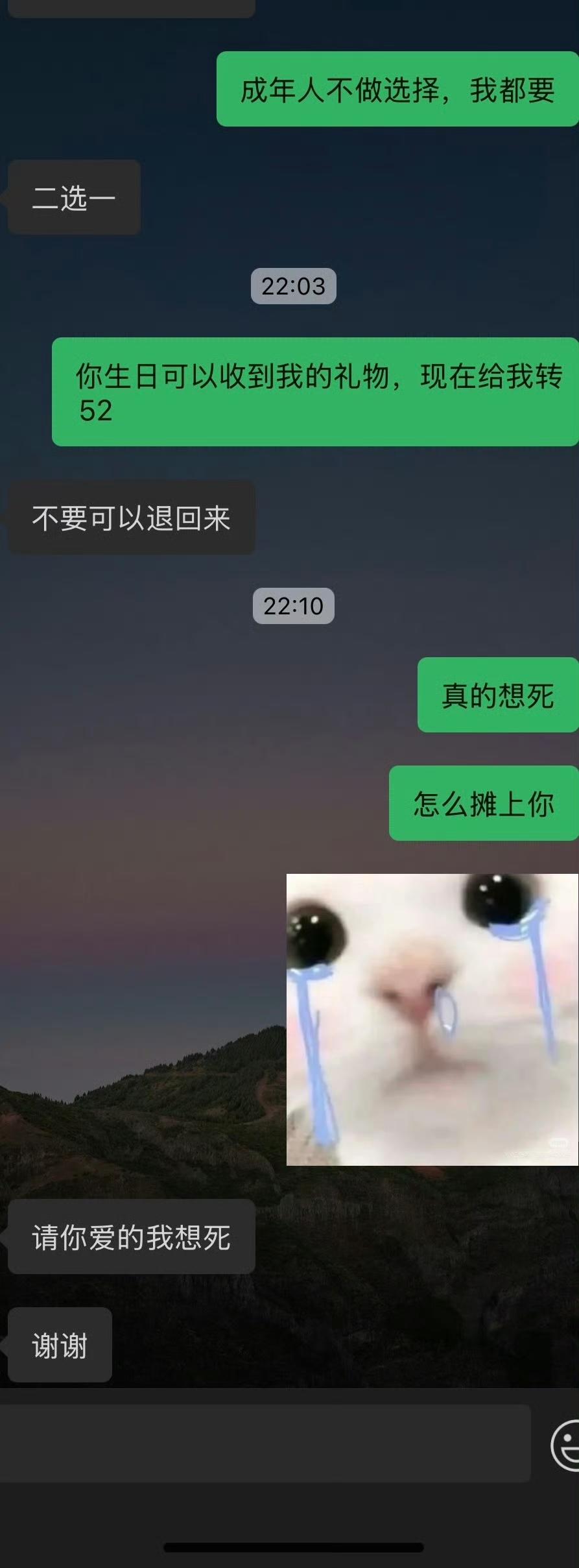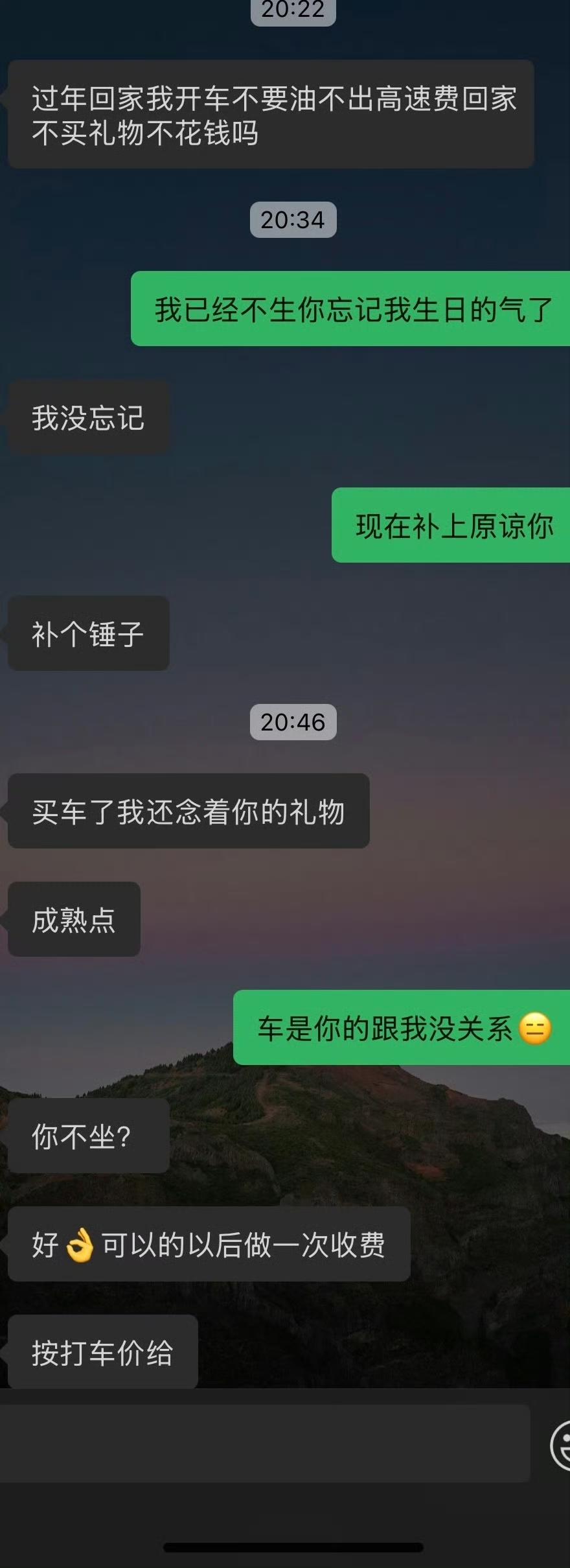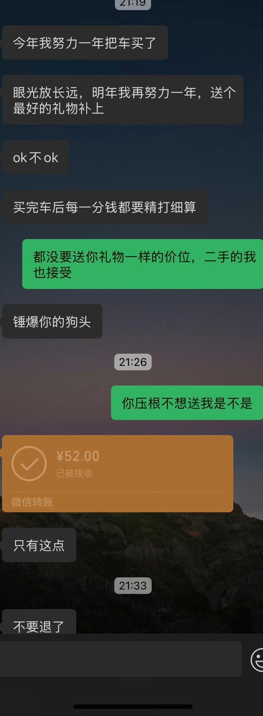 你俩真是天生一对…. 近日,一女网友求助,她想就此事听听大伙的建议!事情是这样的,她生日到了,男朋友没有一点表示,女网友以为对方忘了,于是生日第二天就发信息给男朋友索要礼物,结果男朋友表示没忘记她的生日,但礼物没有…最后男朋友发了52块红包给打发了… 女网友觉得男朋友过生日的时候,她都送了男朋友800多块的礼物,结果到她过生日了,对方不仅一点表示没有,还被说不懂事,她很不开心! 而男朋友的理由是刚买了车,存款只有五六千了,马上就要过年了,要省钱过年,至于女朋友礼物明年再补个大的… 看了聊天记录,他俩真是天生一对,特别是她对象最后说的那句话“请你爱的我想死”,直接把人给整笑了!其实从男朋友装憨不知道你生日的时候,就看出你男朋友一点担当都没有…. 但就算是这样的对象,感觉你也很爱,而且看样子是不会分手的,请你俩锁死好吧!