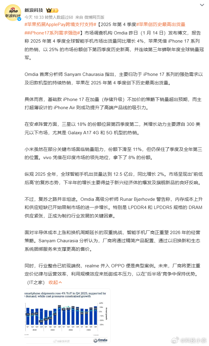苹果创历史最高出货量 太正常了!iPhone17发布前我就说,只要iPhone愿意在外观上大改,绝对是卖爆的节奏,再加上17标准版还把牙膏挤爆了,身边换iPhone17系列的老款钉子户都不在少数。 对了,还有款吸引大家目光的Air呢!