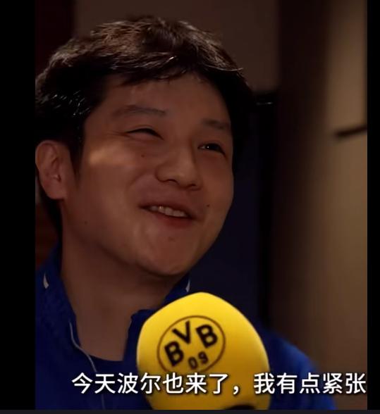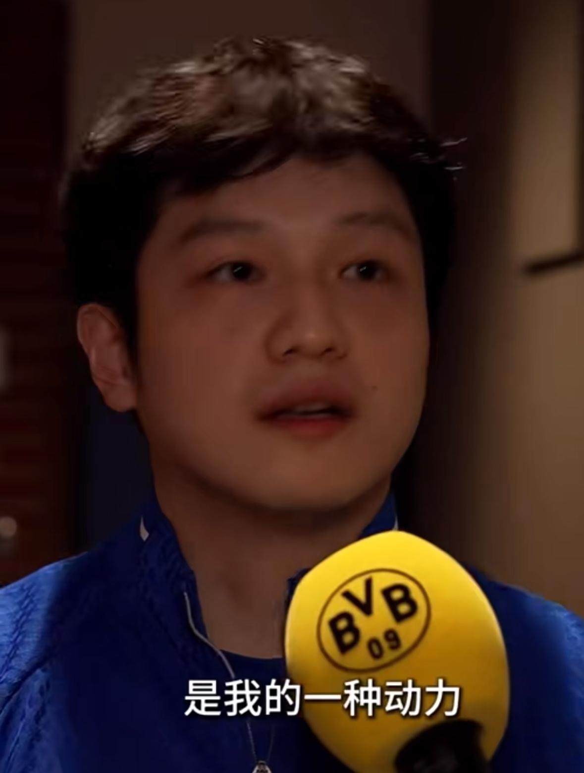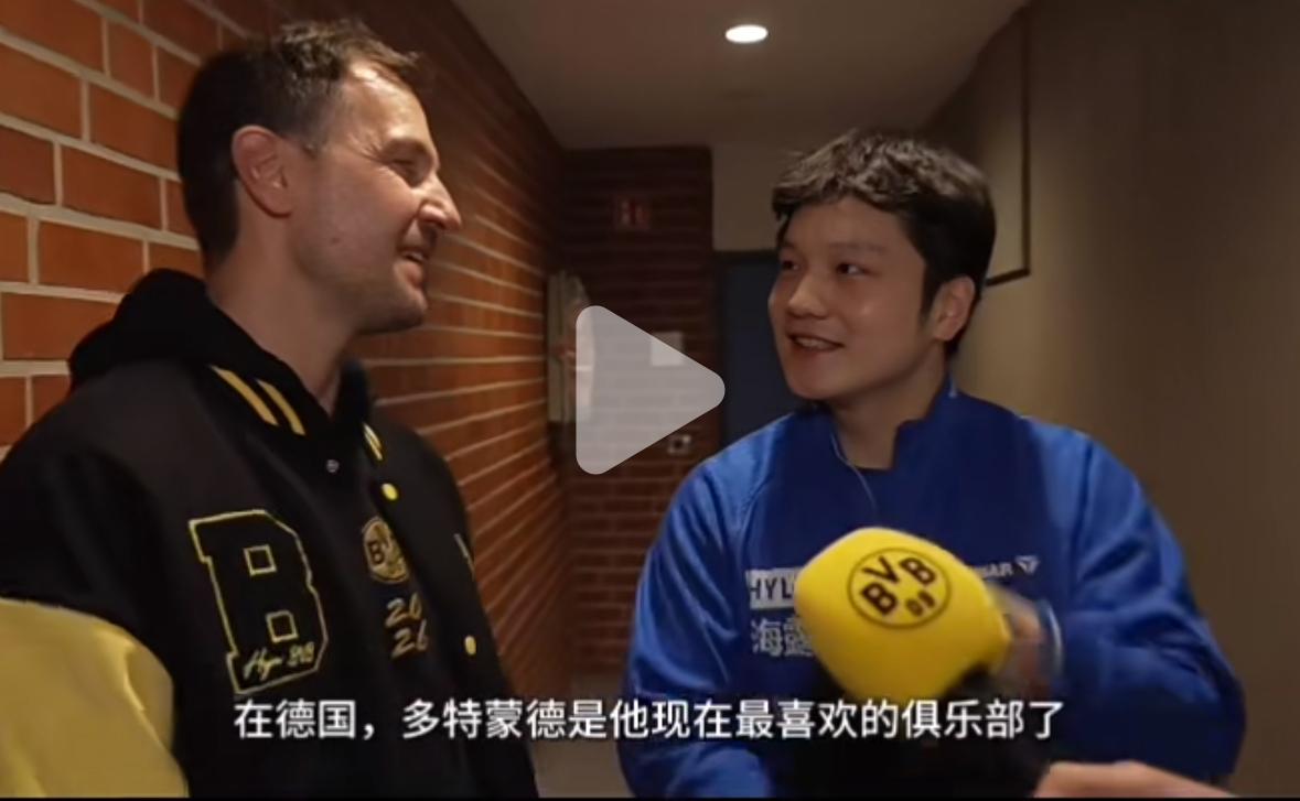 樊振东说球迷的支持是他前进的动力! 多特蒙德对樊振东的采访: 樊振东表示球迷不远万里来支持自己,是对自己的一种动力, 感受到了纯粹的竞技体育的快乐, 热血球迷的支持, 是其中不可或缺的重要组成部分! 同频共振, 樊振东知道球迷爱他! 多特蒙德赠送了樊振东球衣, 并问东哥, 或许你得把你的皇家马德里球衣, 换成多特蒙德的啦! 这么不好回答的问题, 樊振东哈哈哈大笑, 蒙混过关啦!