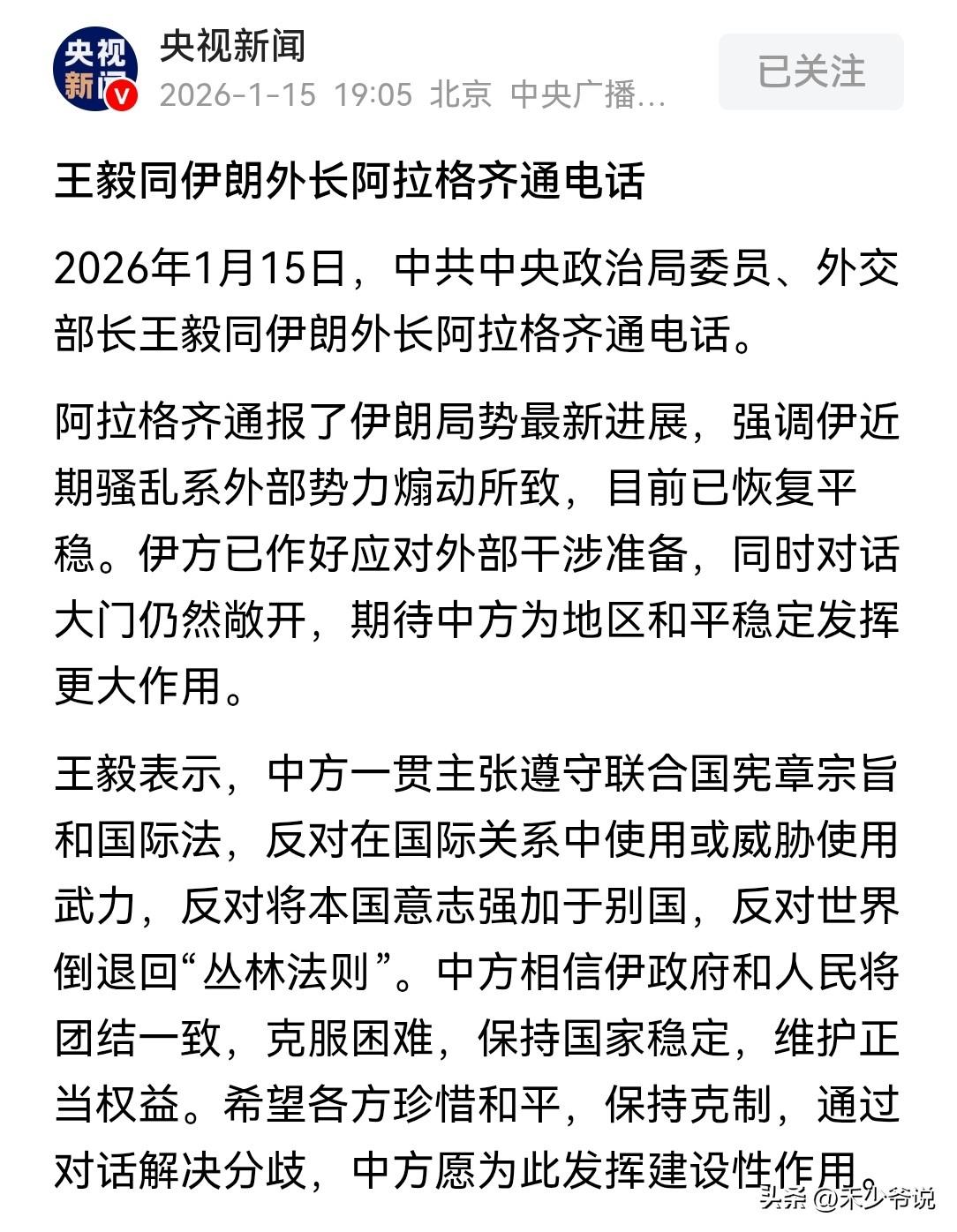 王毅外长首次提及“丛林法则” 今天中共中央政治局委员、外联部部长王毅同伊朗外长阿拉格齐通话。 在通话中王毅外长表示“中方反对将本国意志强加于别国,反对世界倒回“丛林法则””,这也是王毅外长首次在外交场合提及“丛林法则”。 “丛林法则”通常指弱肉强食的丛林世界,而现在美国正在通过武力对委内瑞拉、格林兰岛、伊朗等国发出武力威胁。这就是典型的丛林法则。 而中国反对世界倒回“丛林法则”就是对当前世界局势表明自己的态度。