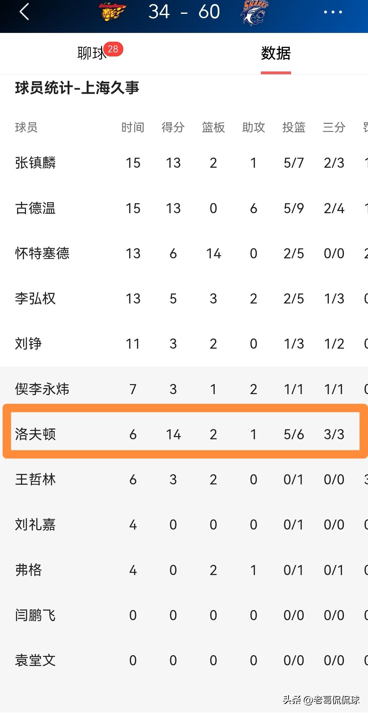 上海久事超级外援洛夫顿真是予取予求!在今天上海久事客场挑战广东东阳光的上半场比赛中,洛夫顿在进攻端真是予取予求、随心所欲,他在替补出战的6分钟里,投篮6中5,其中三分球3中3、罚球3中1轻松砍下14分,还有2篮板1助攻1抢断,他的场上正负值为+7,帮助球队以60:34领先对手结束了前两节的比赛。 毫不夸张的说,在前两节比赛中,洛夫顿在一对一进攻中完全无可阻挡,广东东阳光的球员没人能够限制住洛夫顿。