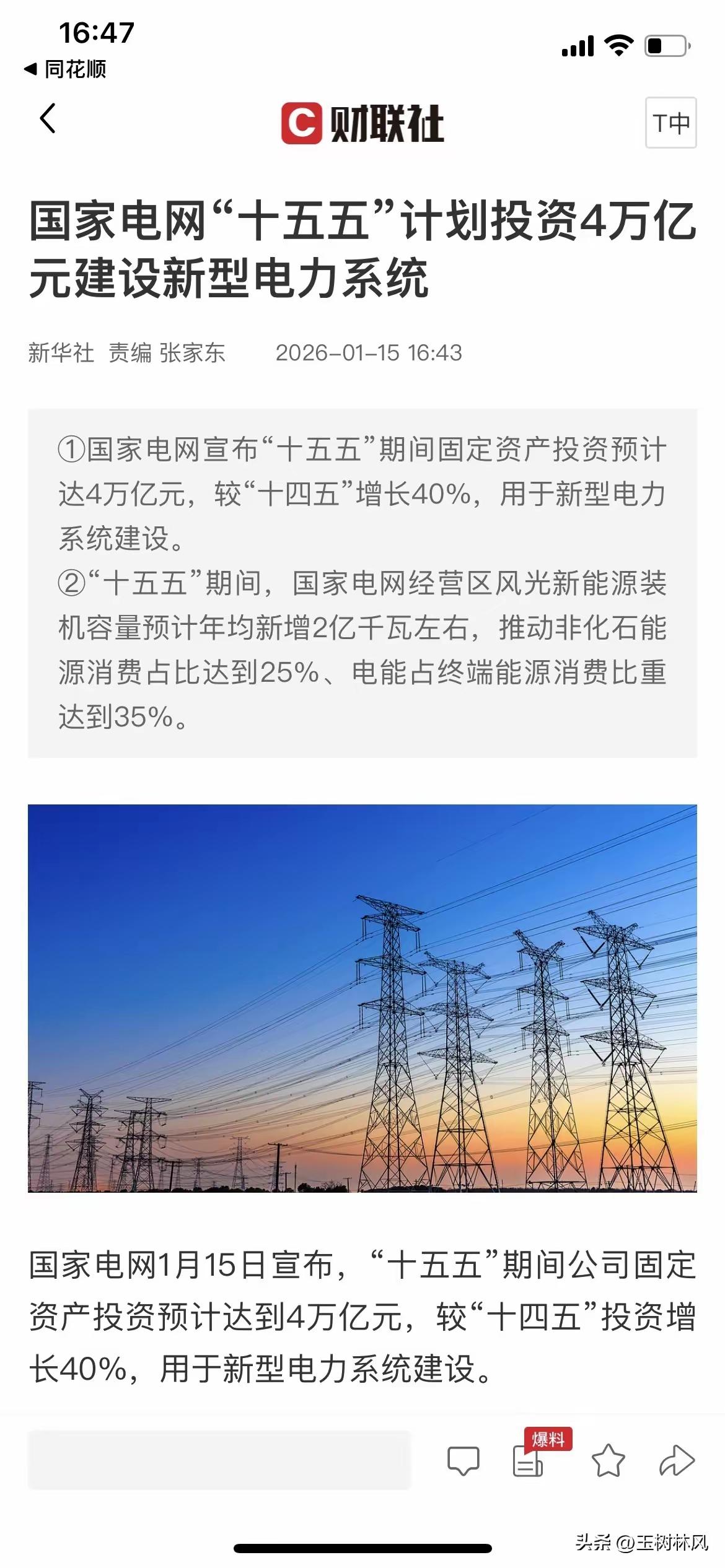 市场风向突变!商业航天、AI应用热潮退去,四万亿电力基建投资强势接棒,龙头特变电工成资金新宠。 📈 2026开年A股大洗牌!商业航天指数单日暴跌2.73%,AI应用概念炒作降温,而电力板块却逆势爆发,电网设备股集体拉升,背后是四万亿基建红利的强力驱动! 国家电网刚官宣:“十五五”期间将砸下4万亿元固定资产投资,较“十四五”暴增40%!这是什么概念?相当于每天要投22亿,带动电源、电工装备、原材料全产业链狂欢。更狠的是,两大电网年均投资将突破万亿,南方电网一季度已率先砸240亿,同比暴涨20%,电力超级周期真的来了! 🔥 风口之上,龙头特变电工正迎来黄金时代!作为国内输变电装备绝对霸主,这家公司早已打通“输变电+新能源+能源+新材料”四大核心业务,完美契合国家电网投资方向: ✅ 特高压领域:覆盖500kV-1000kV全电压等级,换流变压器、电抗器等核心设备直接受益“西电东送”升级,跨区输电能力将提升30% ✅ 新能源配套:适配年均2亿千瓦风光装机需求,多晶硅、逆变器产品供不应求,2024年输变电业务营收增速保持16%高位 ✅ 全球布局:“一带一路”沿线成套工程订单接到手软,从设计到运维的全流程服务能力,让海外收入持续爆发 📊 关键数据说话:2025年国家电网投资已破6500亿创历史新高,2030年将支撑新能源发电量占比达30%,3500万台充电设施、9亿千瓦分布式新能源接入需求,都是特变电工的业绩增量池。公司从2015到2024年营收从375亿飙升至979亿,净利润增长超2倍,随着硅料、煤炭价格触底回升,四大业务即将同步向上! 对比之下,商业航天指数近一周震荡下跌超7%,AI应用赛道内卷加剧,而电力板块背靠政策+业绩双确定性,四万亿投资就像“超级引擎”。特变电工作为全产业链龙头,既吃得到特高压建设的红利,又能分新能源装机的蛋糕,这样的标的在当前市场下简直是稀缺资源! 💡 结语:市场永远在轮动,但政策驱动的硬科技基建不会说谎。四万亿电力投资才刚刚启动,特变电工的估值修复+成长空间值得期待。你觉得电力板块会成为2026年最强主线吗?评论区聊聊你的看法,点赞关注,后续持续跟踪龙头动态!
