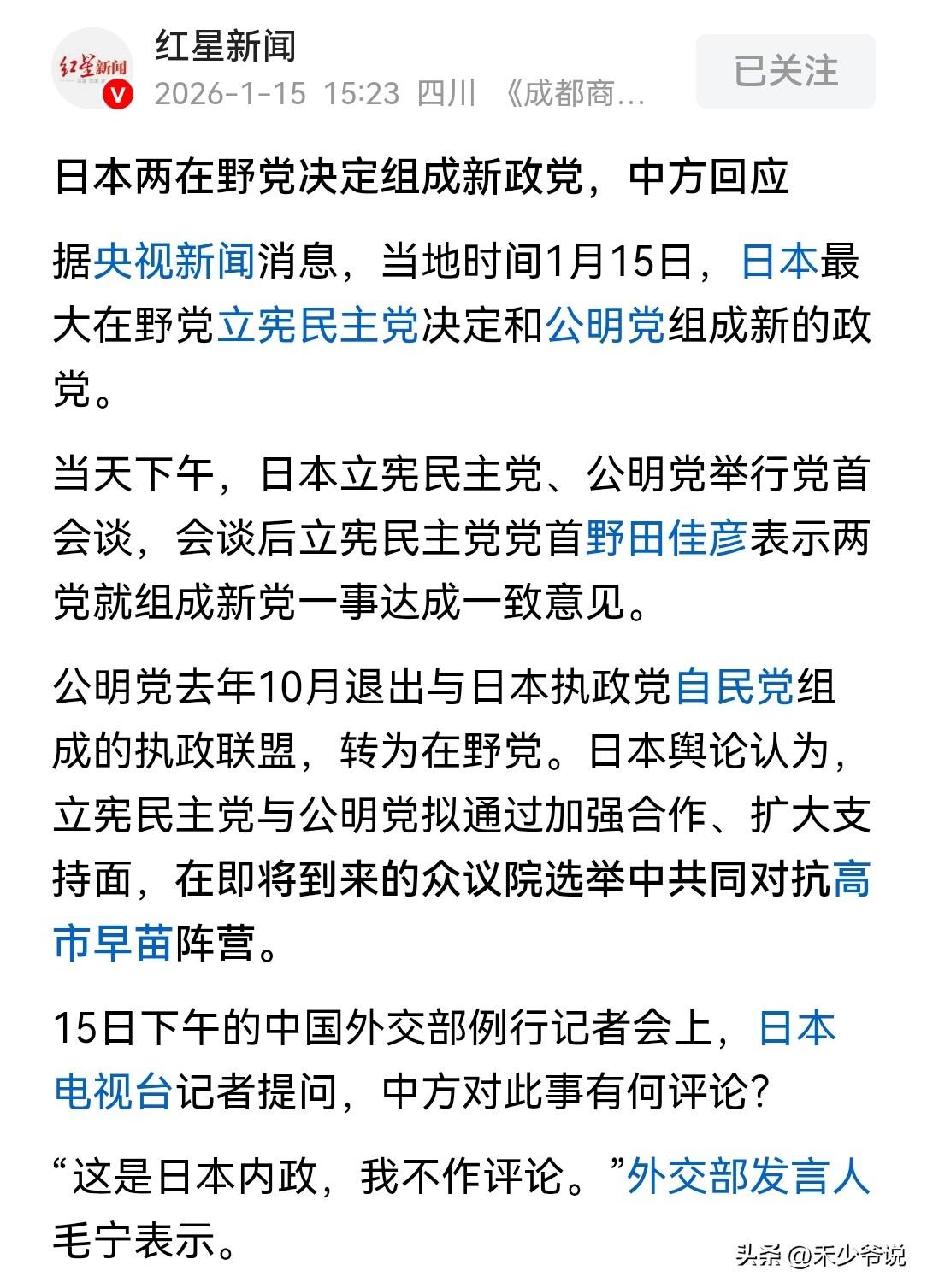 日本自以为是,外交部“懒得搭理” 今天外交部记者会有日本记者提问“日本最大在野党立宪民主党决定和公明党组成新的政党。中方对此有何评论?” 外交部发言人回复“这是日本的内政,我不做评论”潜在意思就是“赖得搭理”日本内政这点破事。