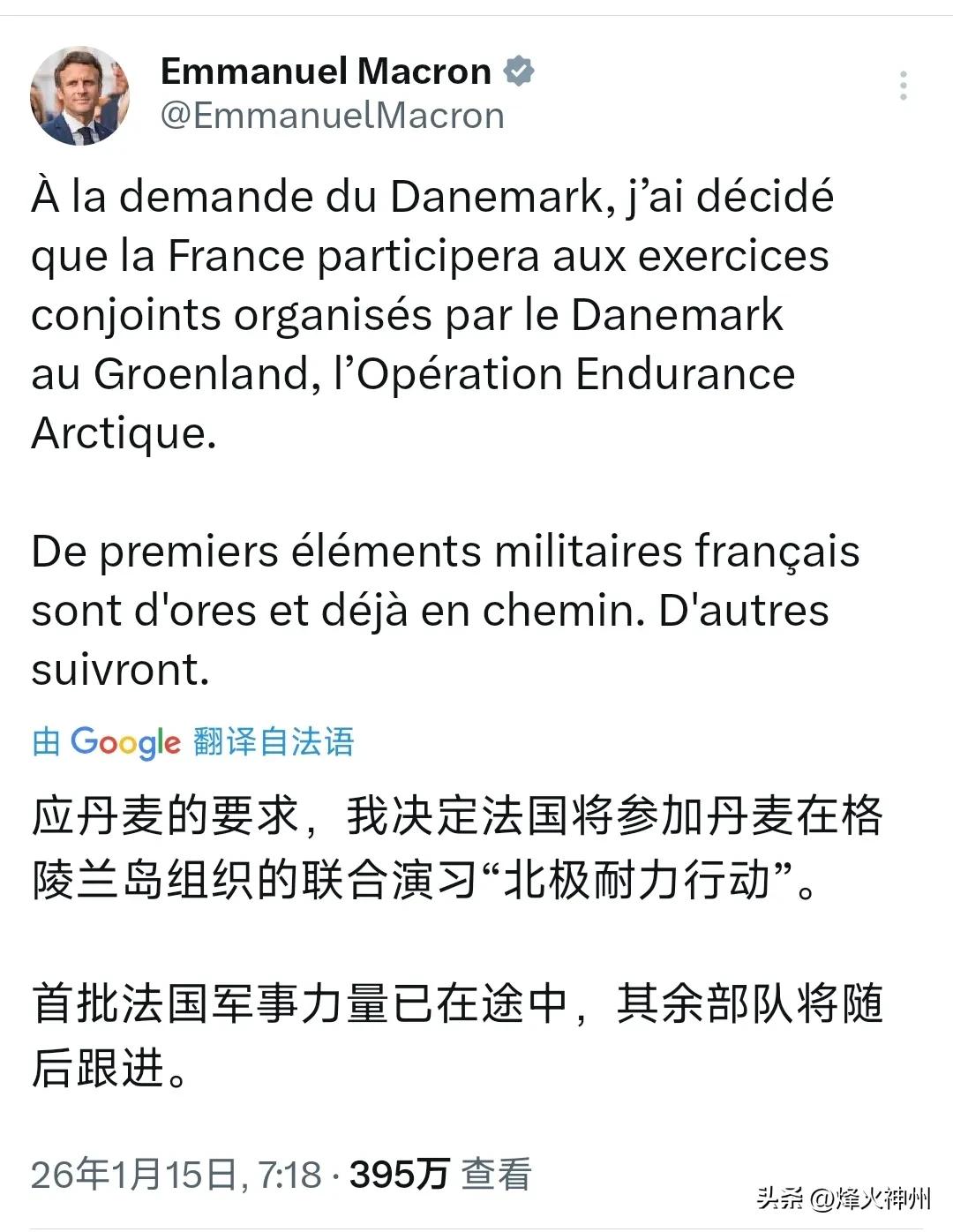 法国总统马克龙今天(北京时间1月15日)写道:“应丹麦的要求,我决定法国将参加丹麦在格陵兰岛组织的联合演习‘北极耐力行动’。首批法国军事力量已在途中,其余部队将随后跟进。” 评几句: 马克龙此举堪称“一石三鸟”的地缘政治豪赌:既以“应丹麦邀请”之名规避直接挑衅美国的舆论风险,又用“北极耐力行动”将法国旗帜插上格陵兰岛,在特朗普“购岛”闹剧后抢占北极话语权真空;更暗含对华盛顿的警告——若美国真敢以“门罗主义”逻辑吞并格陵兰,欧盟核心国家已做好军事对冲准备。这场演习本质是欧洲战略自主的“破冰之旅”:法国借丹麦之口,将欧盟防务触角首次延伸至北极核心圈,既对冲美国对格陵兰的野心,也为后特朗普时代欧美博弈预埋“军事支点”。当欧洲军机掠过北极冰原时,马克龙真正测试的是美国能否接受一个“不再温顺”的盟友开始用枪炮划定自己的势力范围——格陵兰的雪,或许正成为跨大西洋关系解冻前的第一道裂缝。