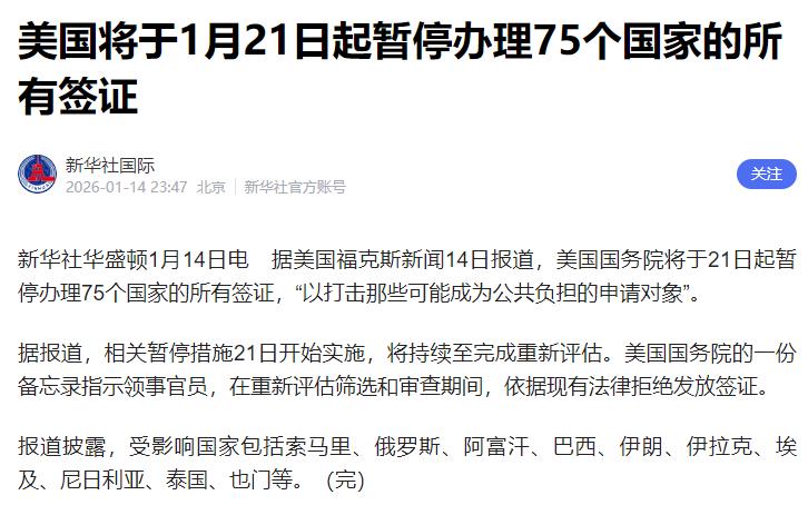 美国将暂停对75个国家发放签证,意味着什么? 当地时间1月14日,美国国务院通过社交媒体正式官宣,从1月21日开始,将暂停受理来自75个国家和地区的移民签证申请,而且这项措施会“持续有效”,直到他们完成所谓的移民审批流程重新评估。 涉及的国家遍布全球,既有俄罗斯、巴西这样的大国,也有阿富汗、叙利亚这样的战乱地区国家,还有泰国、尼日利亚等多个地区的国家,覆盖面之广令人瞠目结舌。 美国官方给出的理由是,这些国家的移民入境后可能会成为“公共负担”,还宣称要“始终把美国放在首位”。可熟悉国际事务的人都知道,美国一直以来都以“移民国家”“机会之地”自居,如今却出尔反尔,用这样的理由大范围关闭签证大门,实在让人难以理解。 其实早在去年8月,特朗普政府就宣布对所有持有效美国签证的外国人展开审查,一旦查出违规就吊销签证或驱逐出境;之后还推出了商务旅游签证保证金计划,对38个国家的申请者收取最高1.5万美元的保证金。 再到今年初,他们先是对多个国家实施全面入境限制,现在又大范围暂停移民签证,一套组合拳下来,封闭的意图已经昭然若揭。而美国这次暂停75国签证,核心就是在拒绝和世界各国进行正常的人员往来。 人员往来是国际合作的基础,不管是商务合作、科技交流还是文化互动,都离不开人与人之间的正常走动。现在美国主动切断这条通道,就是在主动放弃与世界合作的机会。 这种封闭趋势如果持续下去,美国真的可能走向“闭关锁国”的境地,主动把自己变成“世界孤岛”。而又因为其不会放弃世界霸权,在这两个极端中孕育出来的,只会是一个对外更强硬且暴力的政权。 在全球化的今天,没有任何一个国家能够脱离世界独自发展。布鲁金斯学会的经济学家早就预警,移民减少可能导致美国GDP增速下降,美联储主席也直言,移民政策收紧正在挤压劳动力市场,让经济增长放缓。 而且美国的这种做法已经引发了国际社会的广泛批评,联合国官员就指出,他们部分遣返移民的做法可能违反国际法,不少国家也对这种单边主义行为感到不满。 靠筑墙隔绝世界,靠限制签证拒绝合作,不仅解决不了自身的问题,反而会让自己越来越孤立。从曾经的开放包容到如今的关门谢客,美国的转变让人唏嘘。 美国暂停75国签证的举动,已经给世界敲响了警钟,也让我们看清了,所谓的“美国优先”,本质上就是以牺牲国际合作为代价的单边主义,这样的道路注定走不长远。