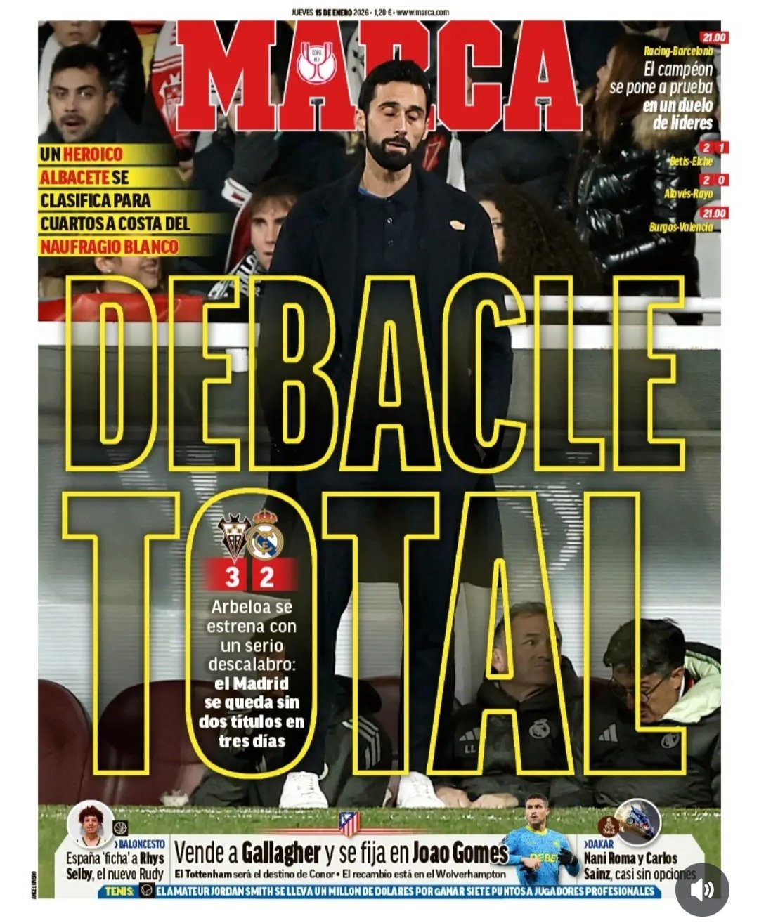 皇马 《马卡》完全崩溃阿韦罗亚在一场巨大的失利首秀: 皇马在三天内失去了两个杯赛阿尔巴塞特历史性的晋级