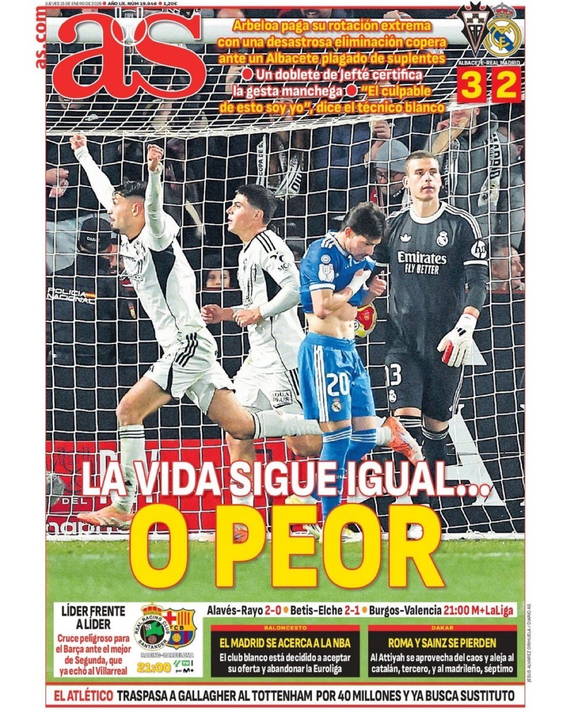 皇马 《阿斯》还是一样。。。或者更糟了面对大量替补的阿尔巴塞特,阿韦罗亚用灾难般的杯赛淘汰为极端的轮换付出了代价阿韦罗亚:“这一切都是我的责任”