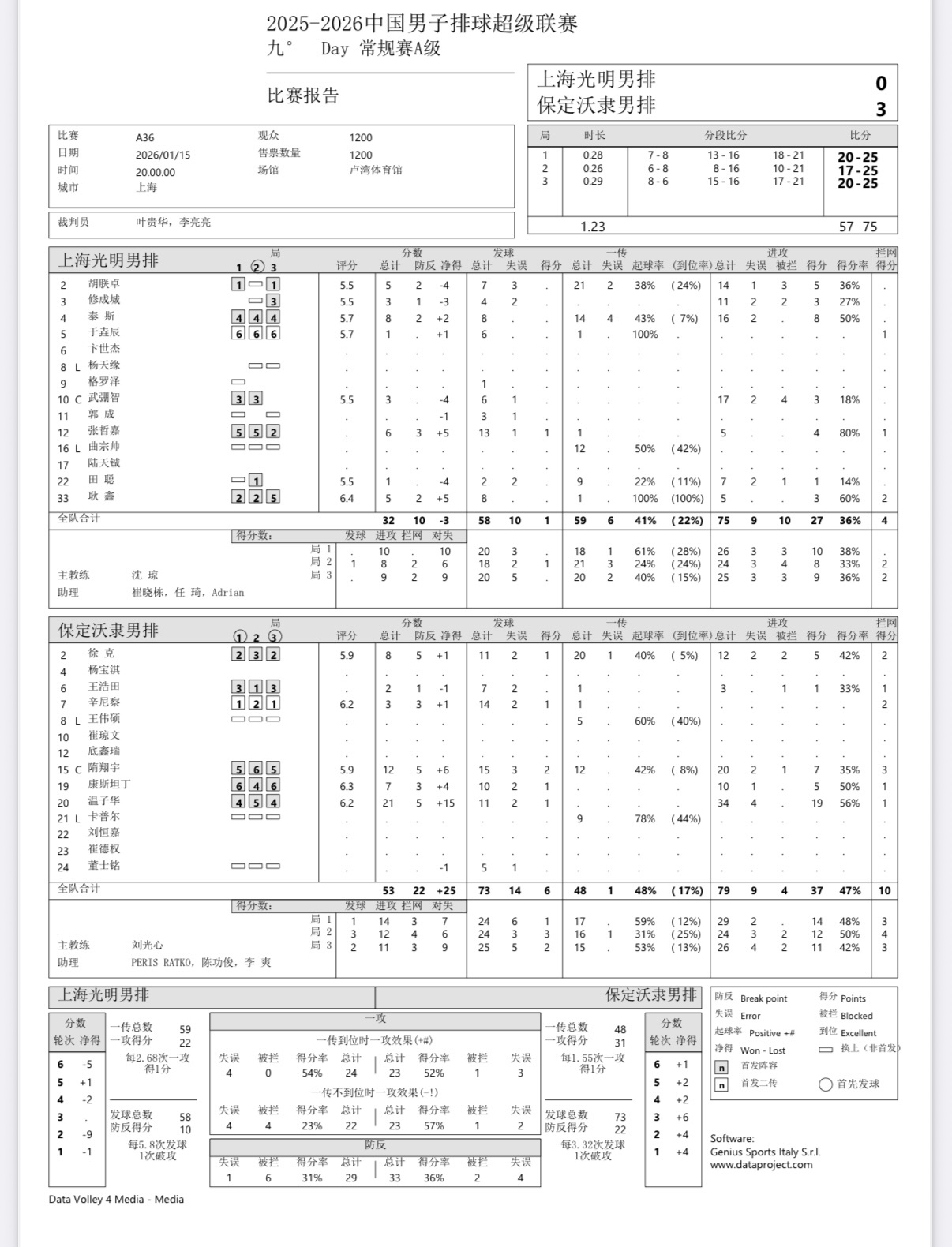 2025-2026中国男排超级联赛 男排联赛第九轮:上海男排主场0-3不敌河北保定男排(20-25,17-25,20-25)。温子华砍下全场最高分21分(34扣19中4失误,1拦1发)