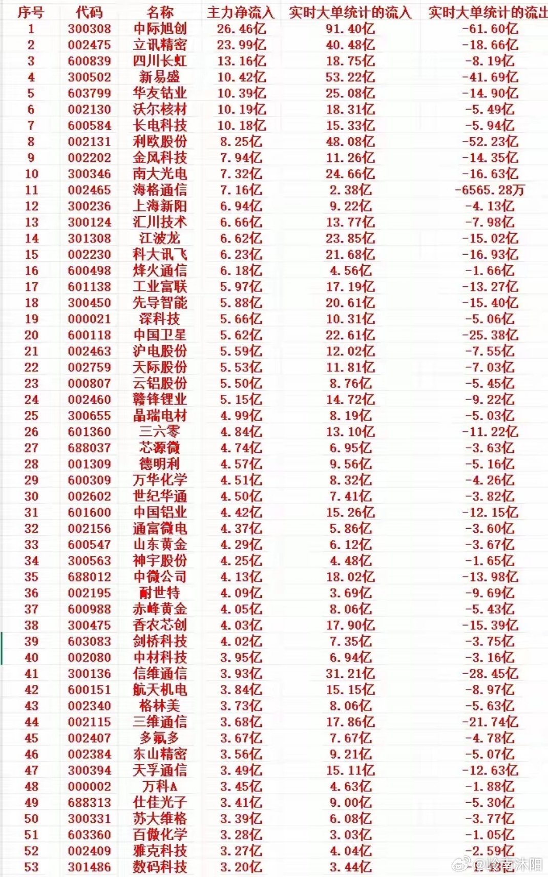 为呈现更清晰的逻辑脉络与专业表述,我将原有信息重新梳理结构,优化语言质感,既保留核心数据与分析要点,又提升内容的可读性与专业性。一、尾盘30分钟主力资金抢筹个股TOP15榜单排名 股票代码 股票名称 主力净流入(亿元) 大单流入(亿元) 大单流出(亿元) 1 300308 中际旭创 26.46 91.40 -61.60 2 002475 立讯精密 23.99 40.48 -18.66 3 600839 四川长虹 13.16 18.75 -8.19 4 300502 新易盛 10.42 53.22 -41.69 5 603799 华友钴业 10.39 25.08 -14.90 6 002130 沃尔核材 10.19 18.31 -5.49 7 600584 长电科技 10.18 15.33 -5.94 8 002131 利欧股份 8.25 48.08 -52.23 9 002202 金风科技 7.94 11.26 -14.35 10 300346 南大光电 7.32 24.66 -16.63 11 002465 海格通信 7.16 2.38 -0.66 12 300236 上海新阳 6.94 9.22 -4.13 13 300124 汇川技术 6.66 13.77 -7.98 14 301308 江波龙 6.62 23.85 -15.02 15 002230 科大讯飞 6.23 21.68 -16.93 二、资金流向核心特征解析1. 头部聚集效应凸显,龙头标的吸金力强劲尾盘资金抢筹呈现显著的头部集中特征,前10只个股的主力净流入金额均突破7亿元关口,资金向核心标的靠拢趋势明显。其中,中际旭创以26.46亿元的主力净流入规模位居榜首,立讯精密紧随其后,主力净流入达23.99亿元,两大标的的资金吸附能力远超其他个股,彰显出市场资金对其投资价值的高度认可与强烈买入意愿。2. 实时大单成交分化,多空博弈程度不一从实时大单成交数据来看,不同个股的资金活跃度与博弈强度呈现鲜明分化。中际旭创成为大单成交最活跃的标的,其大单流入规模高达91.40亿元,同时大单流出亦达61.60亿元,巨额资金的双向流动反映出个股多空博弈的激烈程度。此外,利欧股份与新易盛也呈现出大额大单流入与流出并存的态势,其中利欧股份大单流入48.08亿元、流出52.23亿元,新易盛大单流入53.22亿元、流出41.69亿元,这类个股的多空分歧较为突出。与之形成对比的是,海格通信与烽火通信等标的的大单成交规模相对温和,海格通信大单流入2.38亿元、流出0.66亿元,烽火通信大单流入4.56亿元、流出1.66亿元,资金博弈程度较低,表现出相对稳健的资金流向特征。3. 资金匹配度存差异,部分个股呈现特殊流入结构主力净流入的计算逻辑为“大单流入+大单流出(流出计为负值)”,从实际数据来看,多数个股的主力净流入与大单净流量基本保持匹配,资金流向逻辑清晰。但部分个股呈现出特殊的资金流入结构,例如利欧股份的大单呈现净流出状态(大单流入48.08亿元-大单流出52.23亿元),但其主力净流入仍达到8.25亿元,这一现象或源于中单、小单等资金的补充流入,形成了多元化的资金承接格局。4. 板块偏好清晰,聚焦科技成长与高端制造赛道从榜单个股的行业分布来看,资金布局的产业方向高度集中,主要聚焦于半导体(中际旭创、新易盛、长电科技、上海新阳等)、消费电子(立讯精密)、新能源(华友钴业、金风科技)、军工(海格通信)等核心领域。这一板块偏好清晰反映出当前市场资金更倾向于布局具备高成长潜力与产业景气度的科技成长赛道,以及具备核心竞争力的高端制造领域,产业逻辑成为资金配置的重要指引。