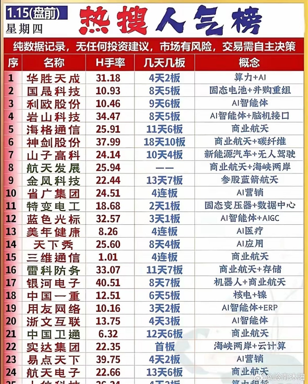 为清晰呈现1月15日盘前热搜人气股的核心逻辑与特征,我将原文结构优化为“整体格局+核心个股详情+市场总结”,语言更流畅且保留所有关键信息:一、盘前人气榜整体格局1月15日盘前热搜人气榜共25只个股上榜,资金聚焦AI、商业航天两大主线,固态电池、机器人等题材同步发力,形成多点开花的题材炒作格局。从交易特征来看,上榜个股普遍换手率偏高,连板效应十分显著,连板股已成为市场人气聚合的核心载体,短线资金围绕题材炒作的情绪尤为浓厚。二、核心人气个股全梳理1. 华胜天成(31.18%换手,4天2板):聚焦算力+AI赛道,凭借算力基建领域布局,成为板块核心人气标的;2. 国晟科技(10.93%换手,8天5板):叠加固态电池+并购重组双重概念,连板走势强势,持续领跑题材;3. 利欧股份(10.46%换手,9天6板):主打AI智能体方向,是AI应用层中活跃度突出的标的;4. 岩山科技(34.47%换手,8天5板):兼具AI智能体+脑机接口概念,高换手率背后凸显筹码博弈的激烈程度;5. 海格通信(25.91%换手,11天6板):深耕商业航天领域,依托扎实的航天通信技术积淀,成为板块核心人气股;6. 神剑股份(37.99%换手,18天10板):覆盖商业航天+碳纤维题材,长期走出“妖股”形态,换手保持活跃;7. 山子高科(24.14%换手,10天4板):聚焦新能源汽车+无人驾驶赛道,获得短线资金重点关注;8. 航天发展(25.94%换手,无连板):叠加商业航天+海峡两岸概念,题材加持下市场关注度持续不减;9. 金风科技(22.44%换手,13天7板):通过参股蓝箭航天切入商业航天赛道,间接受益于板块热度;10. 省广集团(24.51%换手,4连板):主打AI营销概念,是AI应用分支中强势的连板标的;11. 特变电工(18.68%换手,2天1板):兼具固态变压器+数据中心双题材,成为短线资金布局的重点;12. 蓝色光标(32.57%换手,3天1板):覆盖AI智能体+AIGC领域,在AIGC营销应用方面具备显著优势;13. 美年健康(8.26%换手,4连板):聚焦AI医疗赛道,AI体检落地应用,是医疗AI领域的人气标的;14. 天下秀(25.60%换手,8天4板):主打AI应用方向,叠加社交电商+AI概念,连板表现活跃;15. 三维通信(1.01%换手,4连板):深耕商业航天领域,低换手率体现出筹码锁定性极佳的特征;16. 雷科防务(33.07%换手,11天7板):兼具商业航天+存储双题材,高换手率反映资金参与热情;17. 银河电子(40.51%换手,8天7板):叠加机器人+商业航天双题材,形成题材共振效应,资金博弈热度高涨;18. 中国一重(12.51%换手,6天5板):覆盖核电+镍概念,是周期+高端制造领域的人气标的;19. 用友网络(10.16%换手,3天2板):兼具AI智能体+ERP概念,AI赋能企业软件方向实现连板;20. 浙文互联(13.75%换手,4天3板):主打AI智能体概念,是AI板块中活跃的连板标的;21. 中国卫通(6.32%换手,12天6板):作为商业航天板块中军,筹码锁定性良好,持续引领板块节奏;22. 实达集团(22.35%换手,首板):叠加海峡两岸+云计算概念,成为新晋短线关注标的;23. 易点天下(39.75%换手,4天2板):聚焦AI营销赛道,以跨境营销AI赋能为核心,是分支活跃标的;24. 航天电子(22.66%换手,13天6板):深耕商业航天领域,是航天元器件核心供应商,连板走势强势;25. 大位科技(26.24%换手,4天2板):主打算力租赁业务,契合当前AI算力需求,成为短期人气标的。三、市场核心总结短期市场资金明确聚焦AI、商业航天两大核心题材,连板形态成为人气聚集的主要方式,高换手率充分体现出题材内部资金博弈的激烈程度。从炒作逻辑来看,此次题材行情短期性、情绪性特征突出,后续需重点警惕两大风险:一是热点轮动加快可能导致的资金分流,二是情绪退潮引发的题材回调。操作层面,建议重点跟踪核心标的的走势持续性,避免盲目追高,聚焦有资金承接力的优质标的。