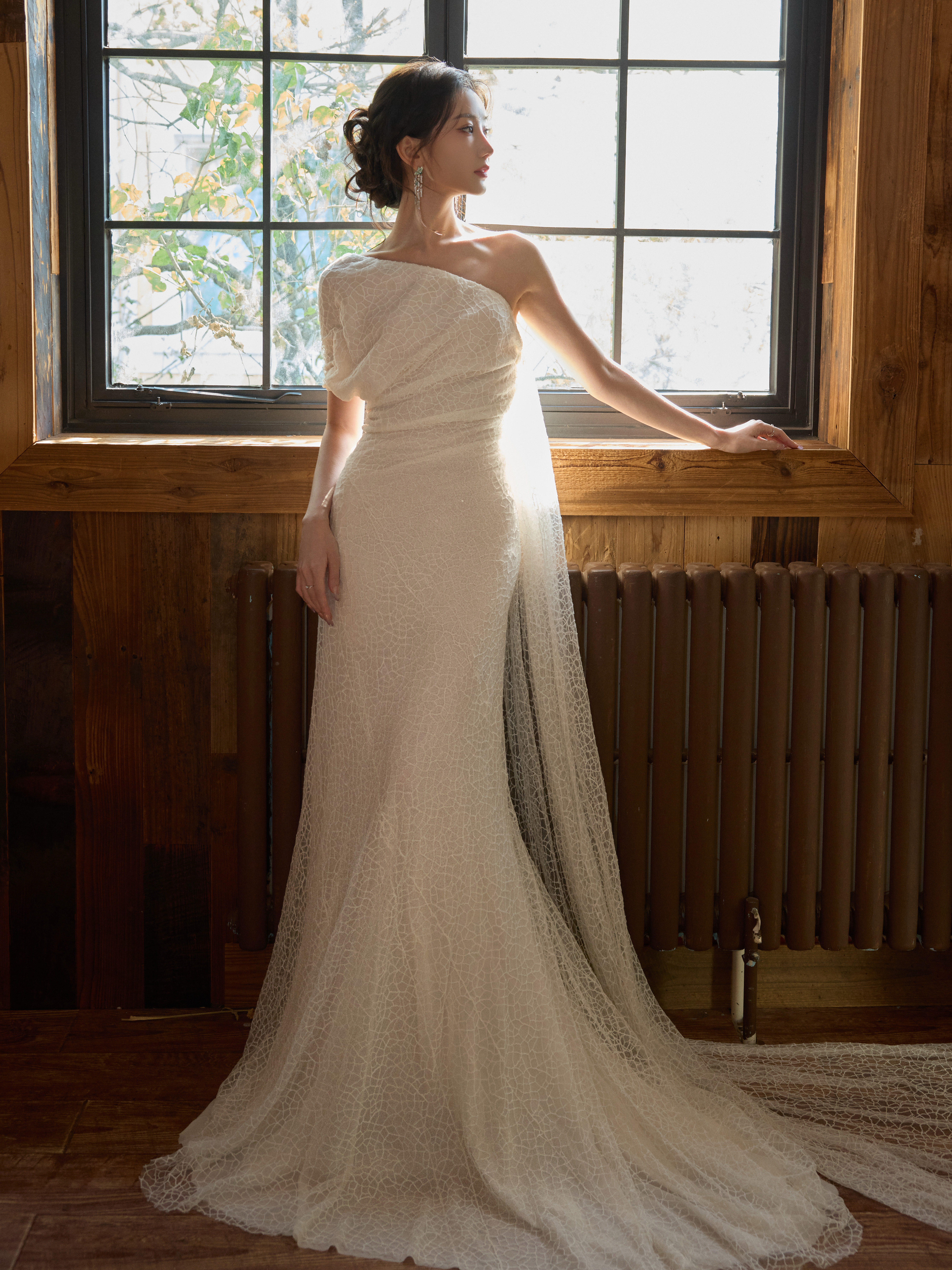 毛晓彤 一袭斜肩白裙似白月光落满肩,在复古窗景里,把温柔酿成岁月的诗。