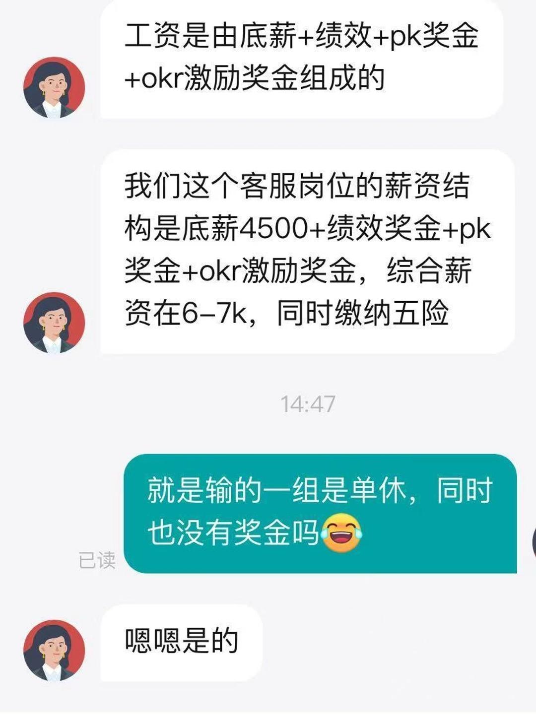 最近深圳有家公司玩出了新花样,把员工休息日变成了“业绩PK战利品”。 HR在招聘客服时,直接告诉求职者:同岗位的人分成两组PK工作数据,赢的组次月按“大小周”休息,输的组每周都是单休,而且连PK奖金都没了。 这事儿听着就让人血压飙升。HR还理直气壮地说,因为人手不足,暂时没有双休,以后可能会有。这话术,听着是不是特别耳熟?就跟“画饼充饥”一个套路。 工资构成是底薪4500+绩效奖金+PK奖金+okr激励奖金,综合薪资在6000-7000元。看起来还行,但仔细一算,这钱挣得可真不容易。 工作数据考核的是线上成交转化率、精准转化率、分配转化率、分配成功转化率等一堆指标。说白了,就是让员工卷起来,用休息时间当赌注。输的那组不仅单休,连PK奖金都拿不到,这不是明摆着克扣吗? 有律师说得一针见血:根据《劳动法》第44条规定,单休如果没有补休,应当支付正常工资2倍的报酬。公司以PK失败为由扣除单休组的奖金,完全没有法律依据。无论哪种休假模式,只要涉及“休息日工作”,都需要补休或付2倍加班费。 现在很多企业都在想方设法压榨员工,但这种把休息日当“战利品”的做法,真的太过分了。员工不是机器,需要休息,需要生活。企业追求业绩可以理解,但不能以牺牲员工基本权益为代价。 这种“内卷式”管理,最终只会让员工身心俱疲,企业也留不住人才。 说到底,企业要想长远发展,还是得把员工当人看,而不是当工具用。双休是基本权利,不是施舍。 希望监管部门能管管这种乱象,让打工人能真正“躺平”休息,而不是在PK中“卷”到筋疲力尽。