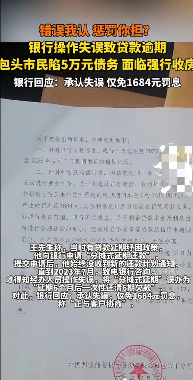 “明明是银行的错,却不纠错,最后变成我承担后果,我不理解” 包头王先生2015年在邮储银行办了13万装修贷,前7年从没逾期,2022年12月他申请“分摊式延期还款”,银行员工操作失误办成“6个月后一次性还6期欠款”,导致贷款逾期。 王先生陷5万债务,还可能被收房,银行承认失误,却只愿免1684元罚息,其他费用仍要他承担,目前还在协商… 吃相太难看了!前7年按时还款的诚信,抵不过银行一次操作失误,还只给这点补偿,这是把“认错不担责”玩明白了!
