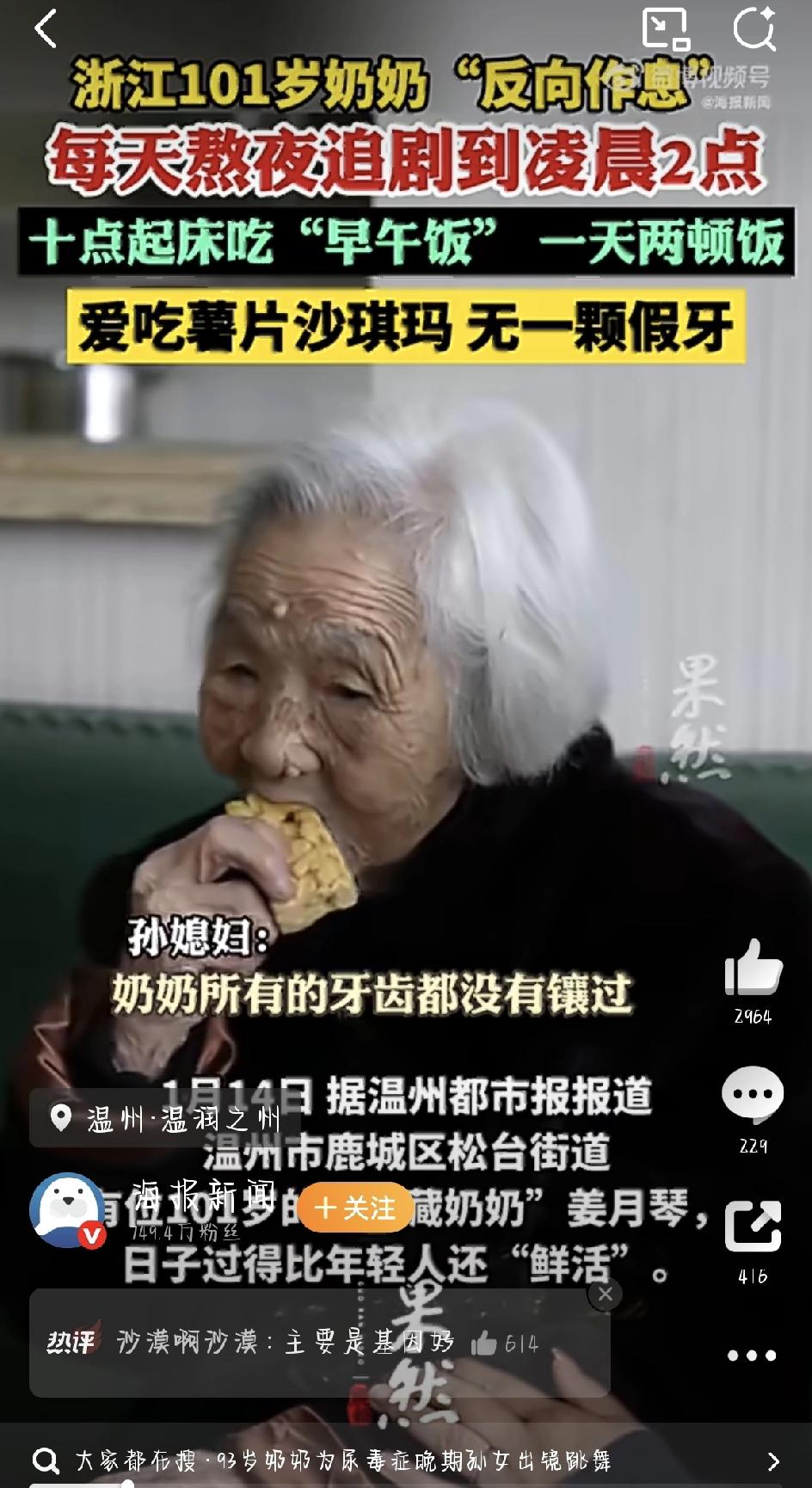 浙江温州这位101岁的姜月琴奶奶,真是一位现实中的“宝藏老人”!她的生活方式,完全打破了大家对百岁老人的想象,甚至过得比不少年轻人还要潇洒自在。你能相信吗?奶奶可是个不折不扣的“夜猫子”,天天熬夜追剧到凌晨两点多才睡,早上睡到十点多自然醒,算下来每天足足睡够八九个小时。更让人羡慕的是,她躺下没几分钟就能睡着,睡眠质量好得不得了。 其实奶奶以前并不是这样的作息。她过去特别勤快,家里总是收拾得干干净净,一有空就爱出门散步、晒太阳。后来因为一次不小心摔倒伤了手,手术后子女们心疼,再也不让她干家务了。白天闲下来觉睡得多了,晚上反而睡不着,就靠看电视打发时间,久而久之,就养成了晚睡的习惯。 每天起床洗漱后,奶奶第一件事就是泡上一杯浓浓的绿茶,轻轻抿一口,慢慢品味——这个习惯她已经坚持了好多年。 说到吃,奶奶更是让人佩服。一辈子没镶过假牙,至今一口好牙,咬起硬东西来一点不费劲。她还是个“零食控”,家里藏着一个“零食宝库”,其中最爱的是温州本地特色小吃马蹄松,每天必须吃两块才过瘾。不用掰,直接塞进嘴里嚼,酥皮金黄金黄的,有时沾在嘴角也顾不上擦,吃得特别香。除了马蹄松,沙琪玛、番薯枣这些年轻人嚼着都费劲的零食,她也吃得津津有味,甚至还像年轻人一样爱吃薯片,时不时就拿一片解解馋。 别看奶奶现在不爱主动出门,年轻时可是个爱闯荡的旅行达人。40多岁就和老伴一起去爬黄山,到现在还会念叨“那山真高,风景真好”;80多岁时在杭州租了房子,一住就是大半年,把西湖、西溪湿地逛了个遍;89岁那年,她还硬是爬上了南京中山陵那高高的台阶,一步一步坚持走到了顶。前前后后,她去过二十多个城市,和老伴的旅行故事,至今仍是家里津津乐道的回忆。老两口当年是巷子里出了名的恩爱夫妻,总手牵手散步、晒太阳,老伴还常给她当“翻译官”,讲电视剧、念新闻,感情好得让人羡慕。 说到长寿秘诀,奶奶的女儿一句话就点破了:“吃好睡好心态好,不生气、不较真,心里不装事儿。”奶奶性格温和了一辈子,从不跟人红脸,说话轻声细语,待人接物总是彬彬有礼。年轻时为了照顾七个子女,她放弃了工作,把所有的温柔都给了家庭;如今百岁高龄了,还常常顺手帮孙辈拉拉外套拉链,吃饭时悄悄往晚辈碗里夹菜。 现在家里晚辈轮流陪着奶奶,把她当年付出的温柔,一点点回馈给她。这位101岁的奶奶,用自己鲜活的日子告诉我们:长寿从来不是死板的养生公式,而是活得自在、过得通透。想吃就吃,想睡就睡,心里不装烦心事,把每一天都过得有滋有味——这大概就是最好的养生吧! 来源:海报新闻